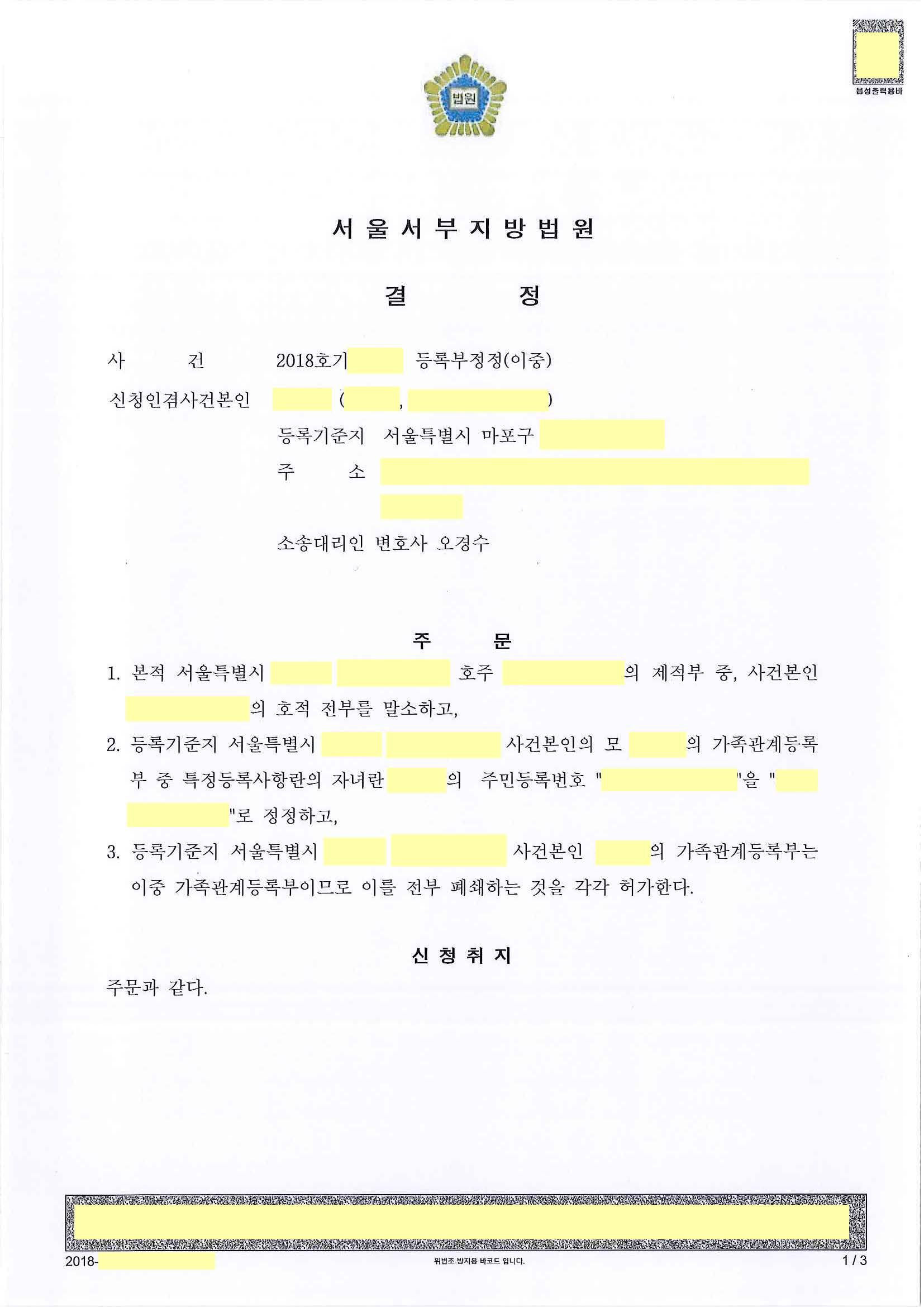 모가 혼외자를 출산하였습니다. 부는 법률상 배우자와 사이에서 태어난 것으로 출생신고. 그 후 모가 부와 자신 사이에 태어난 것으로 다시 출생신고하여 이중 가족관계등록부가 편제되었습니다.