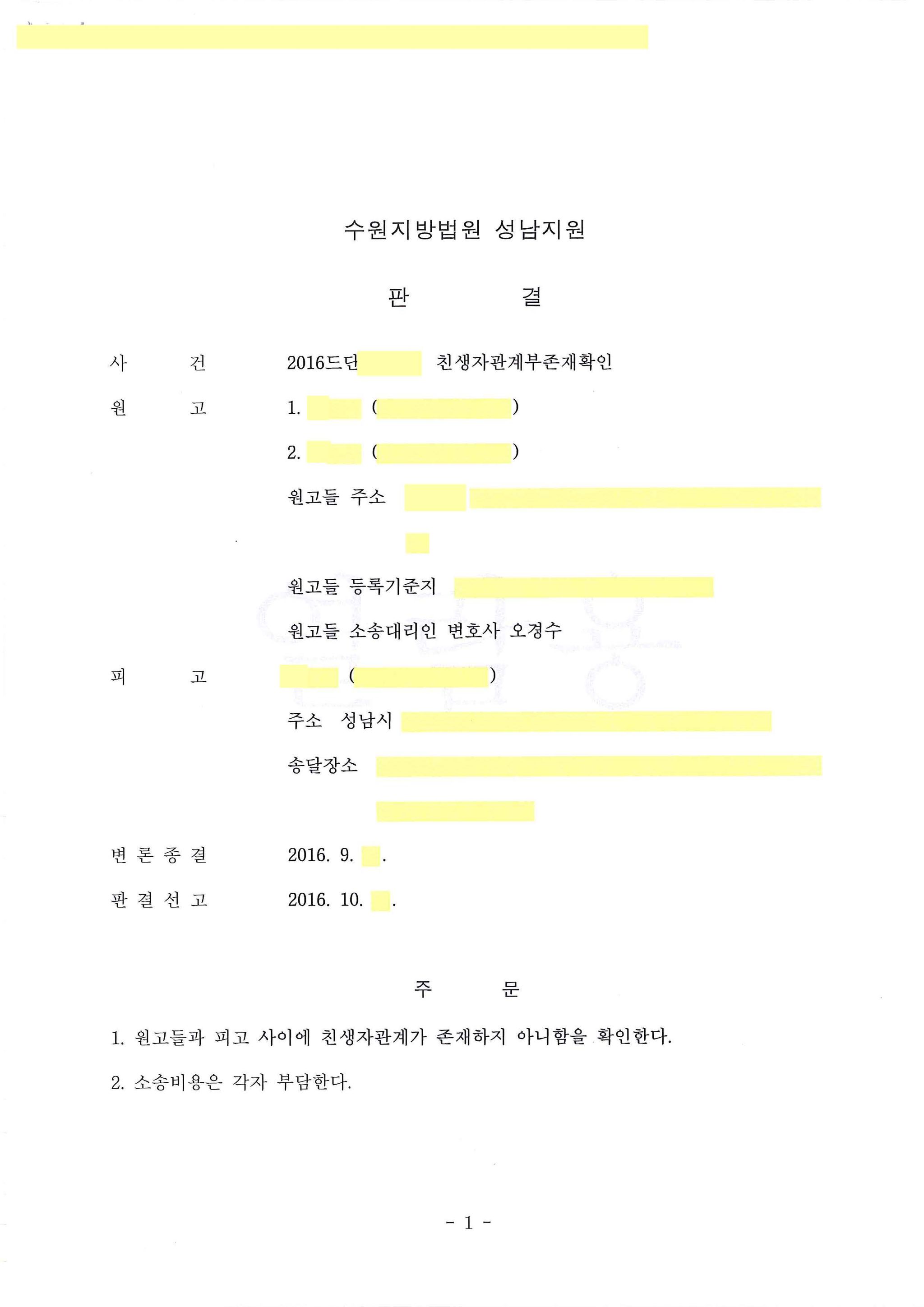 원고 부부가 고아인 피고를 데려와서 출생신고를 한 후 양육했습니다. 원고 부부와 피고와 갈등이 생겨 파양을 하기로 합의하였습니다. 그러나 출생신고를 했기 때문에 친생자관계부존재확인의 소를 진행해야 했던 사안입니다.