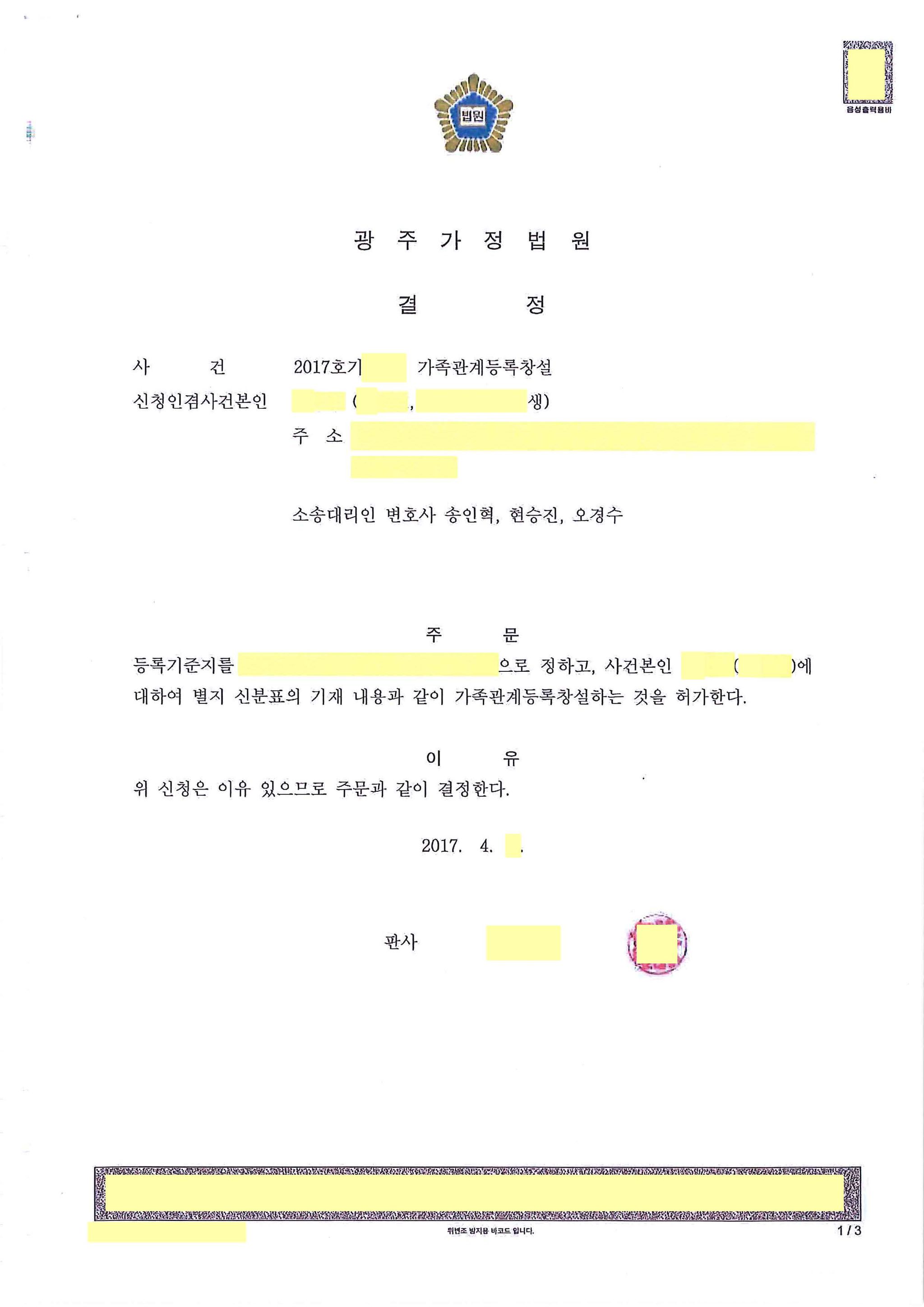 친생자관계부존재확인의 소 승소 및 성본창설, 가족관계등록부창설 인용하여 성공적으로 마무리가 된 사안입니다.