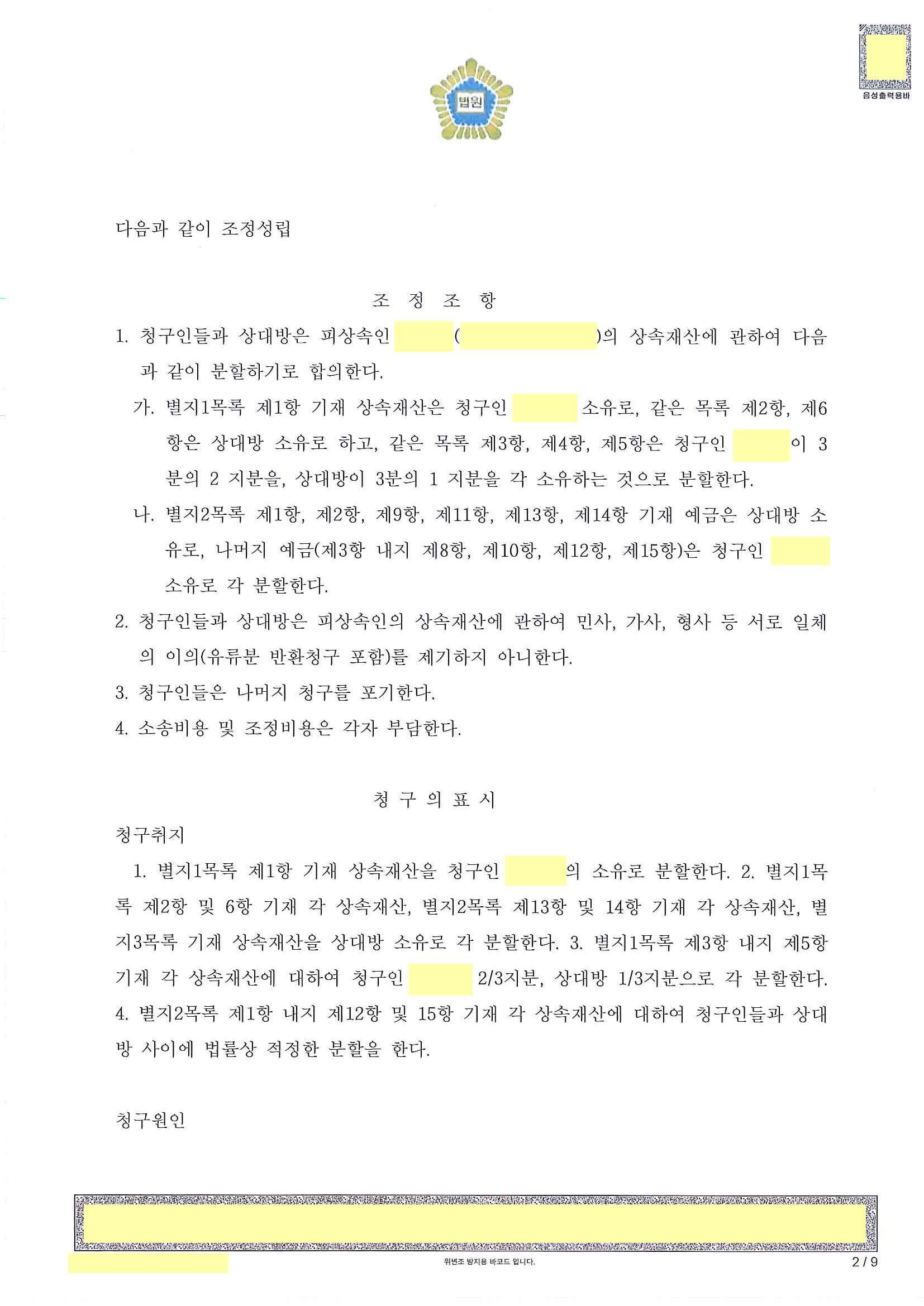 실제 소송에서 상대방은 청구인들이 제시하는 안을 고의적으로 거부하였습니다. 이에 청구인의 소송대리인은 가장 중요한 재산인 아파트에 현재 피상속인의 배우자이자, 상대방의 어머니가 거주를 하고 있고 앞으로 거주를 해야 해서 피상속인 배우자가 단독으로 소유해야 할 필요가 크고, 이에 승낙하면 다른 재산에서 조금 더 청구인들이 양보를 하겠다는 취지로 변론하였습니다. 이에 조정부도 그런 방향으로 조정을 유도하였습니다. 결국 조정에서 가장 중요한 재산인 아파트를 피상속인 배우자가 단독소유하는 것으로 하고, 다른 재산을 그에 맞게 정리하는 것으로 마무리하였습니다.