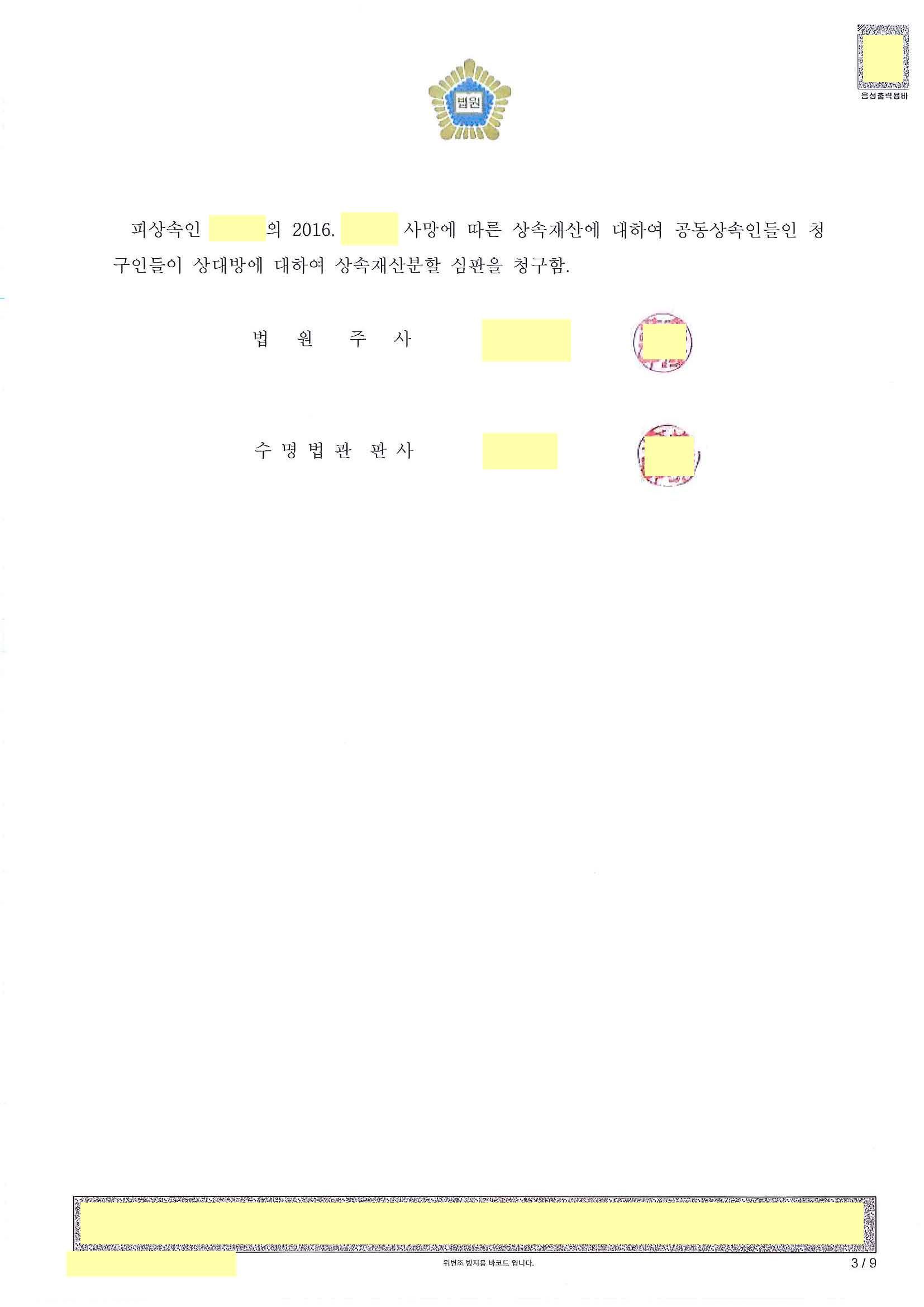 피상속인이 배우자와 1남 2녀를 두고 사망하였습니다. 장남이 다른 상속인들과 연락을 고의적으로 회피, 거부하였습니다. 가장 중요한 재산은 피상속인과 배우자가 거주하고 있었던 아파트였습니다. 장남은 이 아파트를 피상속인의 배우자가 단독으로 취득하면 나중에 자신을 빼놓고 다른 형제들에게만 재산을 줄 것을 우려하여 모든 재산은 무조건 1/n으로 나눌 것을 요구하였습니다. 도저히 협의를 이룰 수 없어 장남을 상대방으로 하여 상속재산분할심판청구를 제기하였습니다.