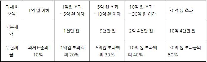 그렇기 때문에 가급적 상속재산분할절차를 조속히 마무리하는 것이 좋고, 분쟁이 해결되지 않으면 일단 상속세 처리부터 하는 것이 여러모로 좋습니다. 참고로 상속세 및 증여세의 세율을 간락히 안내해 드리겠습니다. 이 세율은 각종 공제액을 반영하고 남은 금액(과세표준액)에 대한 비율이니 참고하셔야 합니다.