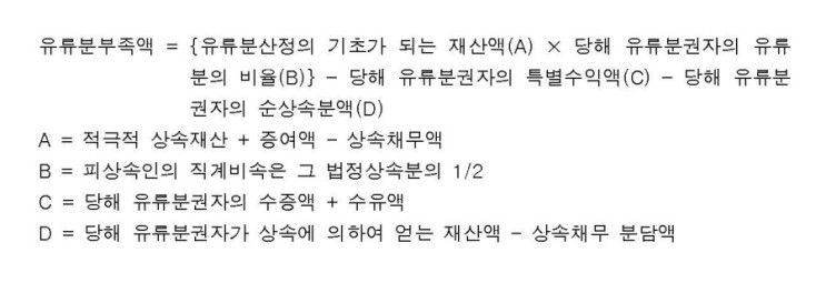 유류분부족액은 유류분산정의 기초가 되는 재산액에 유류분 비율을 곱하고 나서 당해 유류분권자가 받은 재산을 빼면 계산할 수 있습니다. 여기서 당해 유류분권자가 받은 재산을 빼야 한다는 점이 중요합니다. 즉, 유류분 부족분을 반환한다는 뜻이죠.