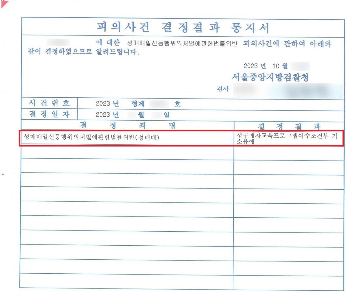검찰에서는 최종적으로 의뢰인에 대하여 "성구매자교육프로그램이수조건부 기소유예"처불을 내렸습니다. 성매매는 최근 집중 단속이 이뤄지고 있는 만큼 초범이더라고 하더라도 적절한 대응을 하지 못한다면 1년 이하의 징역이나 300만원 이하의 벌금에 처해질 수 있습니다.