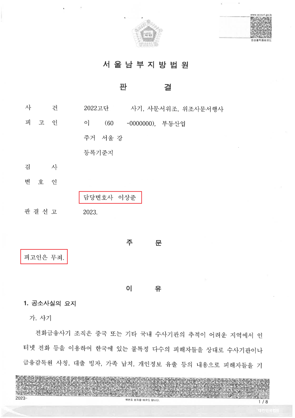 의뢰인에게는 보이스피싱으로 징역형을 선고받은 전력이 있었기 때문에 법원이 저의 주장을 받아주지 않을까 걱정되었던 것은 사실입니다. 그러나 저는 의뢰인의 말을 끝까지 믿었고, 의뢰인에게 보이스피싱의 고의가 없었음을 끝까지 변호하였습니다. 그 결과 법원은 의뢰인에게 무죄를 선고하였습니다. 의뢰인은 끝까지 믿어주고, 싸워준 저에게 너무 감사하다고 말해주셨고, 저도 너무 뿌듯하고 기뻤습니다.