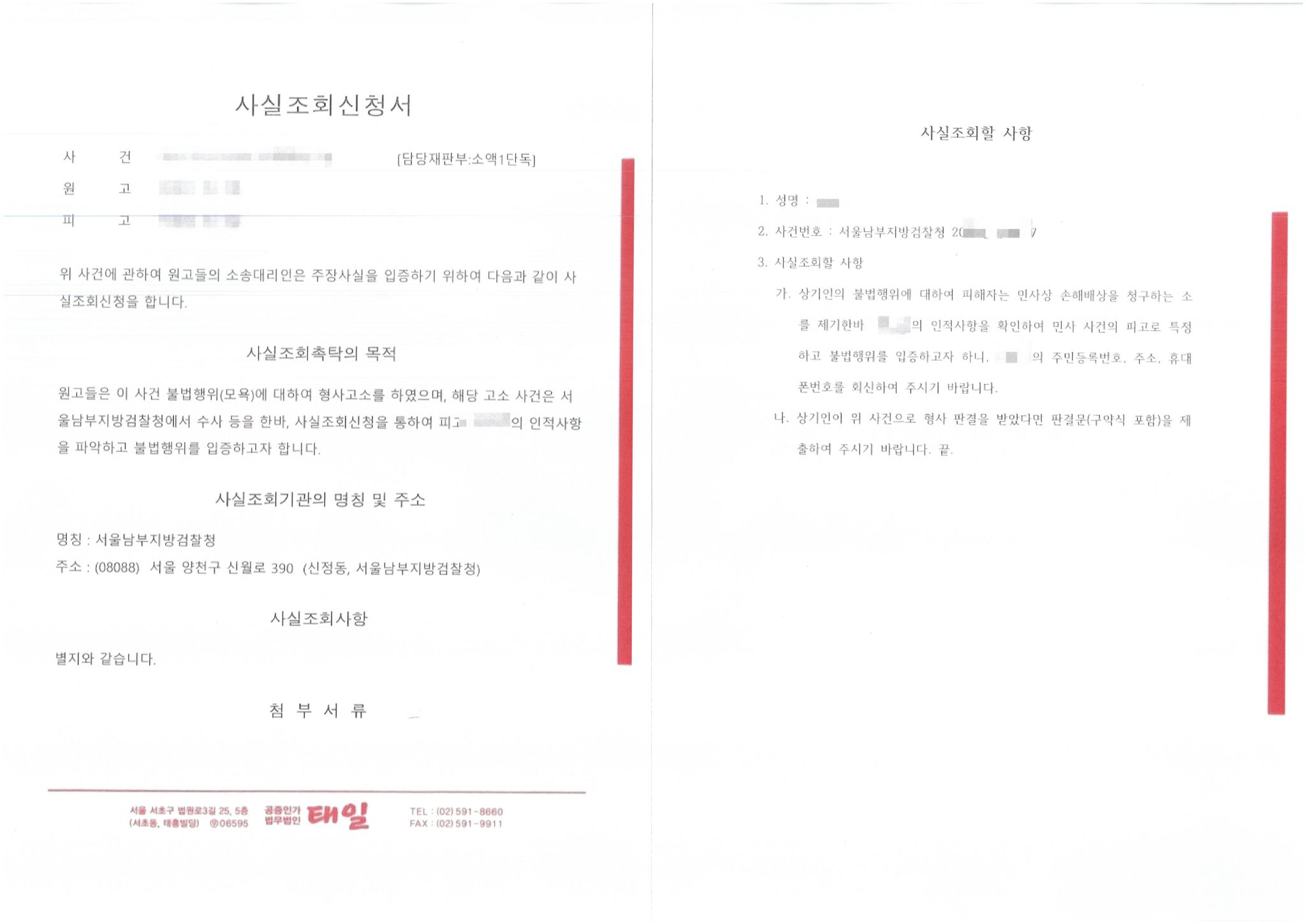 검찰청이 보유하고 있는 가해자(또는 피고인, 민사소송에서는 피고에 해당함)에 대한 인적사항 및 법원의 형사판결문을 제공받기 위한 사실조회신청하기