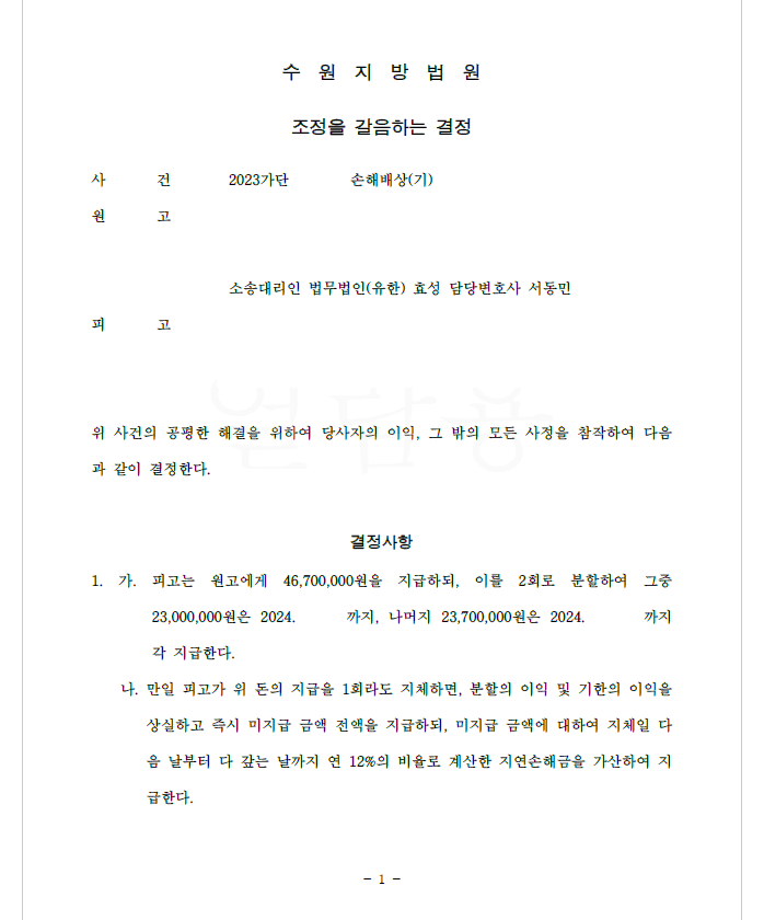 저는 즉각 가해자를 피고로 하여 민사소송 불법행위 손배청구를 하였고 법원은 가해자가 의뢰인에게 피해액 전액을 분납하는 내용의 강제조정을 하여 확정되어 의뢰인은 돈을 돌려받게 되었습니다.
