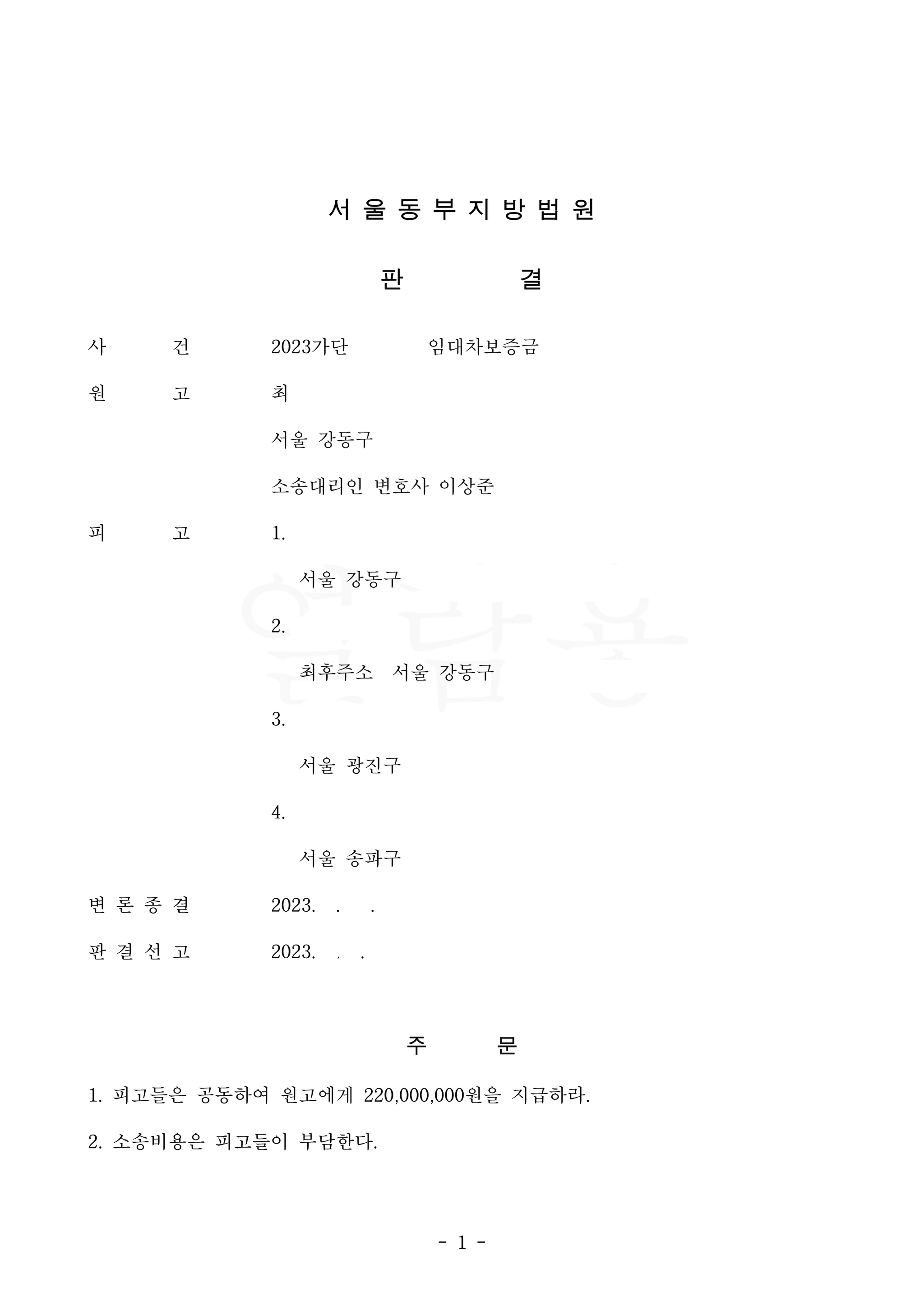 임대차보증금반환 청구 소송을 제기한 지 2달 만에 전부 승소 판결을 받았고, 가압류해 둔 전세사기범들의 재산에 대한 경매를 신청하였습니다.