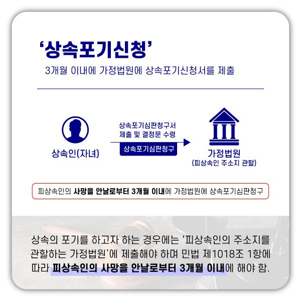 그러나 부모님께서 남긴 재산은 없으신 반면 채무(빚)만 남아 있는 경우에는 가정법원에 상속포기 절차를 통하여 피상속인의 채무로부터 보호받을수 있습니다.