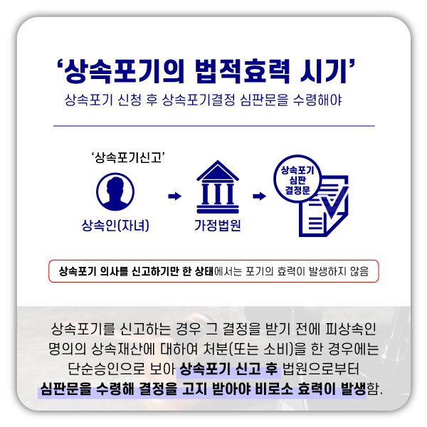 따라서 상속을 원하지 않아 상속포기를 하고자 하는 상속인은 우선 피상속인의 사망 후 3개월 이내에 상속포기를 신고해야 하고, 그 결정을 고지 받기 전까지는 피상속인의 재산을 처분하거나 소비하지 않아야 합니다.
