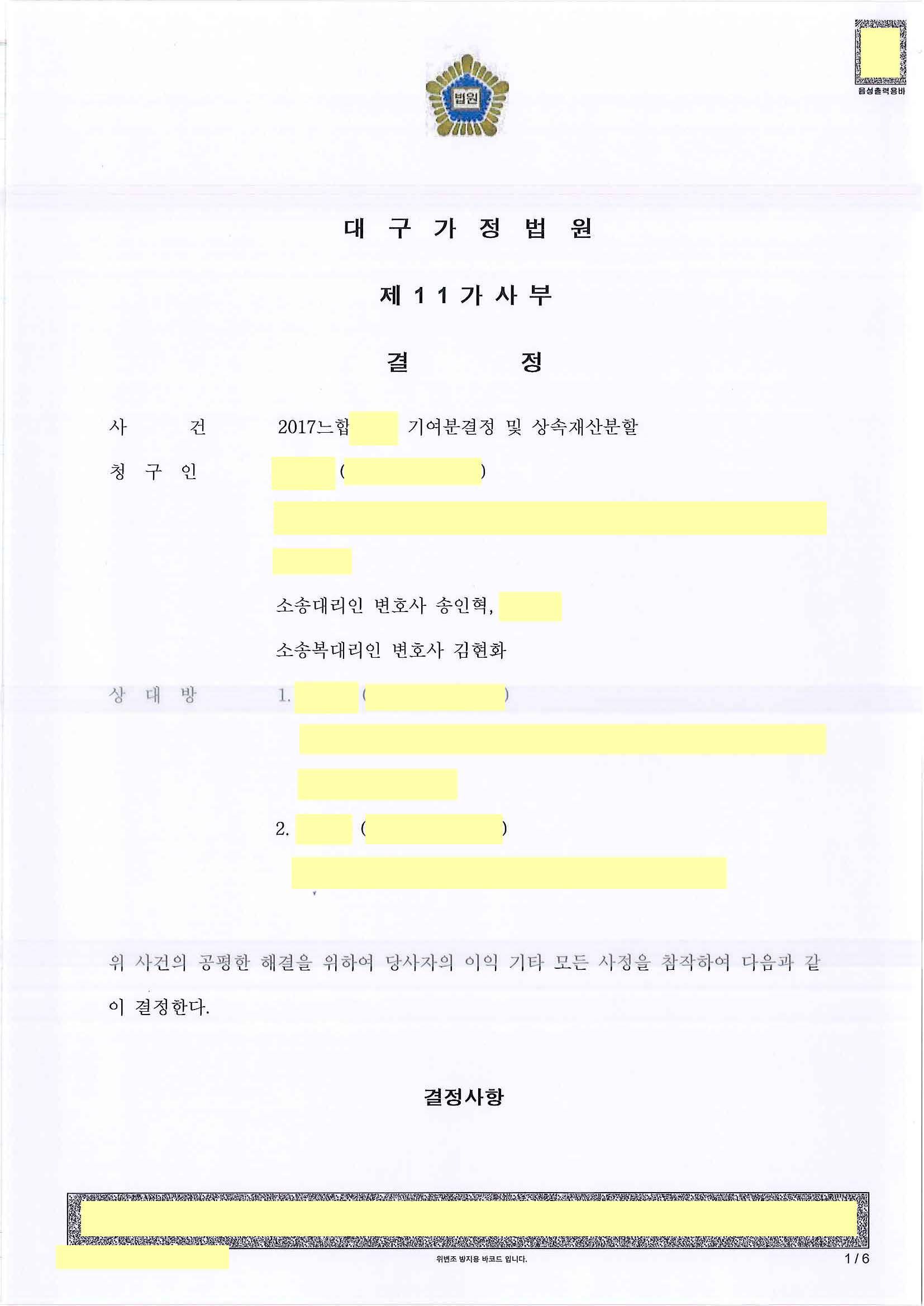 청구인만이 피상속인을 부양했다는 점을 계속 주장. 그리고 상속 부동산은 세 형제가 똑같이 나누고 나머지 재산은 청구인이 분할받는 것으로 조정. 청구인은 30%의 기여분 주장을 하였는데 조정으로 분배받은 재산의 시가를 따지면 청구인들이 36%의 기여분을 인정받은 결과.