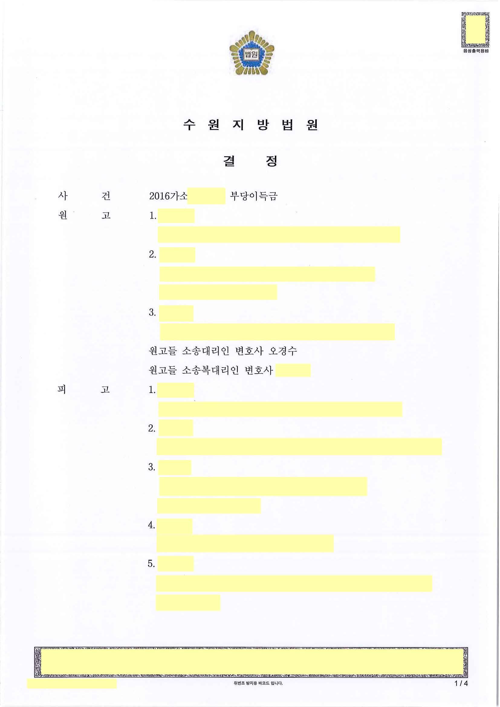 피상속인인 원고들의 외조부입니다. 피고들은 피상속인의 배우자 및 자녀들. 원고들의 모친 사망 이후 원고들은 외가와 단절된 채 살아왔습니다. 피상속인 사망 후 수 년이 지나 토지보상 문제 때문에 피고 2가 찾아와 분할협의를 요구하였습니다. 이때서야 원고들은 피상속인의 사망 사실을 인지했습니다. 또한 피상속인이 투병 중에 피고들이 재산을 무단 인출했다는 정황이 있었습니다. 이에 원고들은 부당이득금 반환 및 유류분반환청구의 소를 제기했습니다.