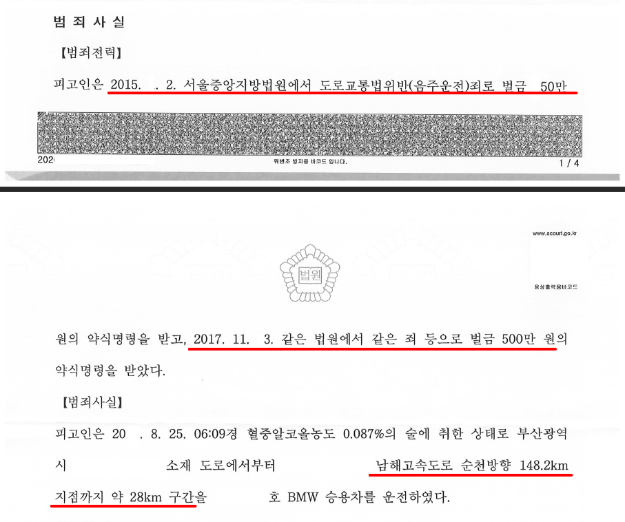 요약 : 2015.부터 2년 간격으로 음주운전 반복, 주취상태에서 경부고속도로 주행, 고속도로 주행 중 갓길 잠듬, 검사 2년 구형 → 집행유예