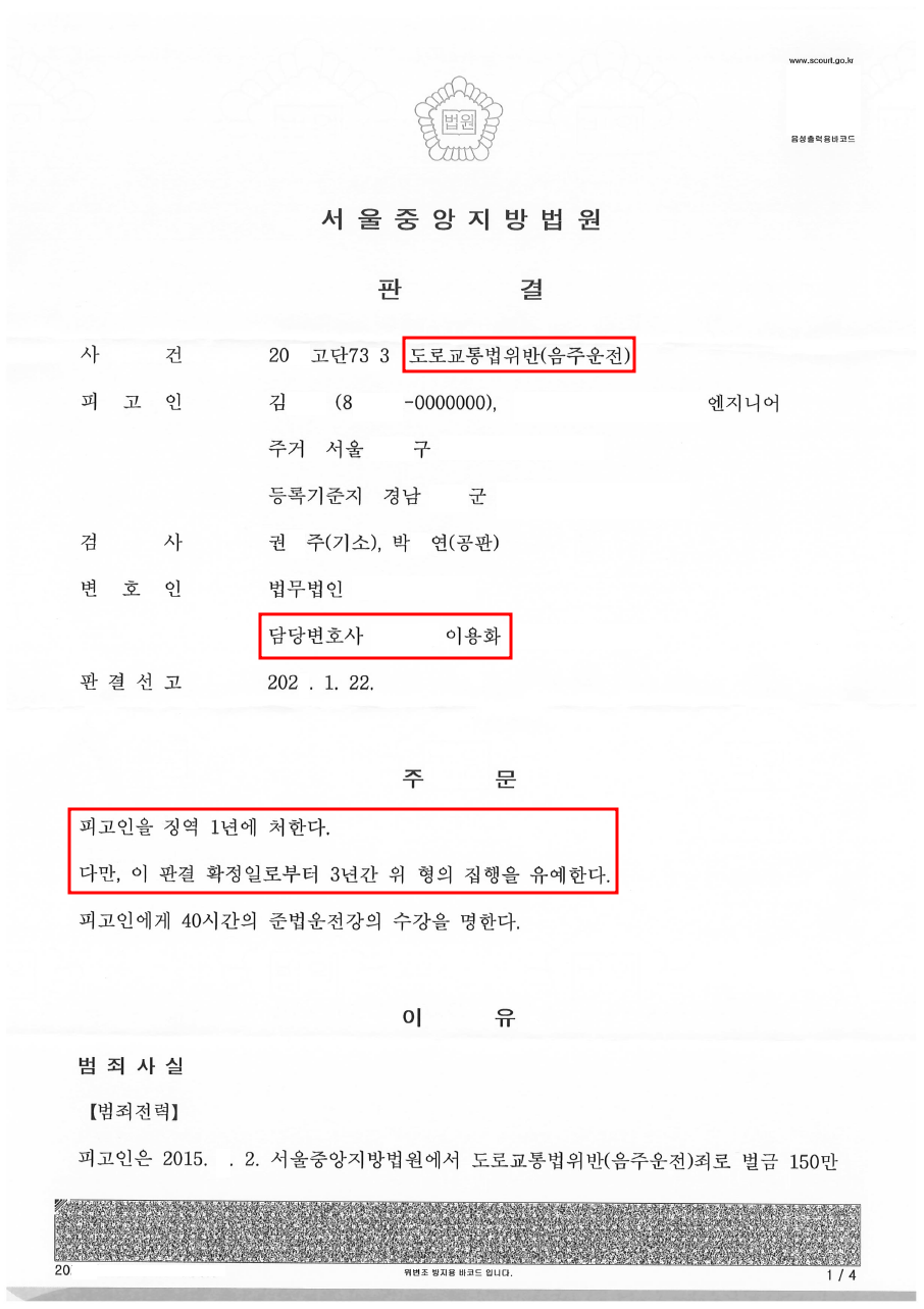 + 2년 간격으로 반복된 3번째 음주운전, 검사의 징역 2년 구형에도 불구하고, 구속을 면하였던 이 사건 판결에 관한 상담이 필요하신 경우, < PLATZ > 플라츠 공동법률사무소 이용화 대표변호사에게 연락주시기 바랍니다.