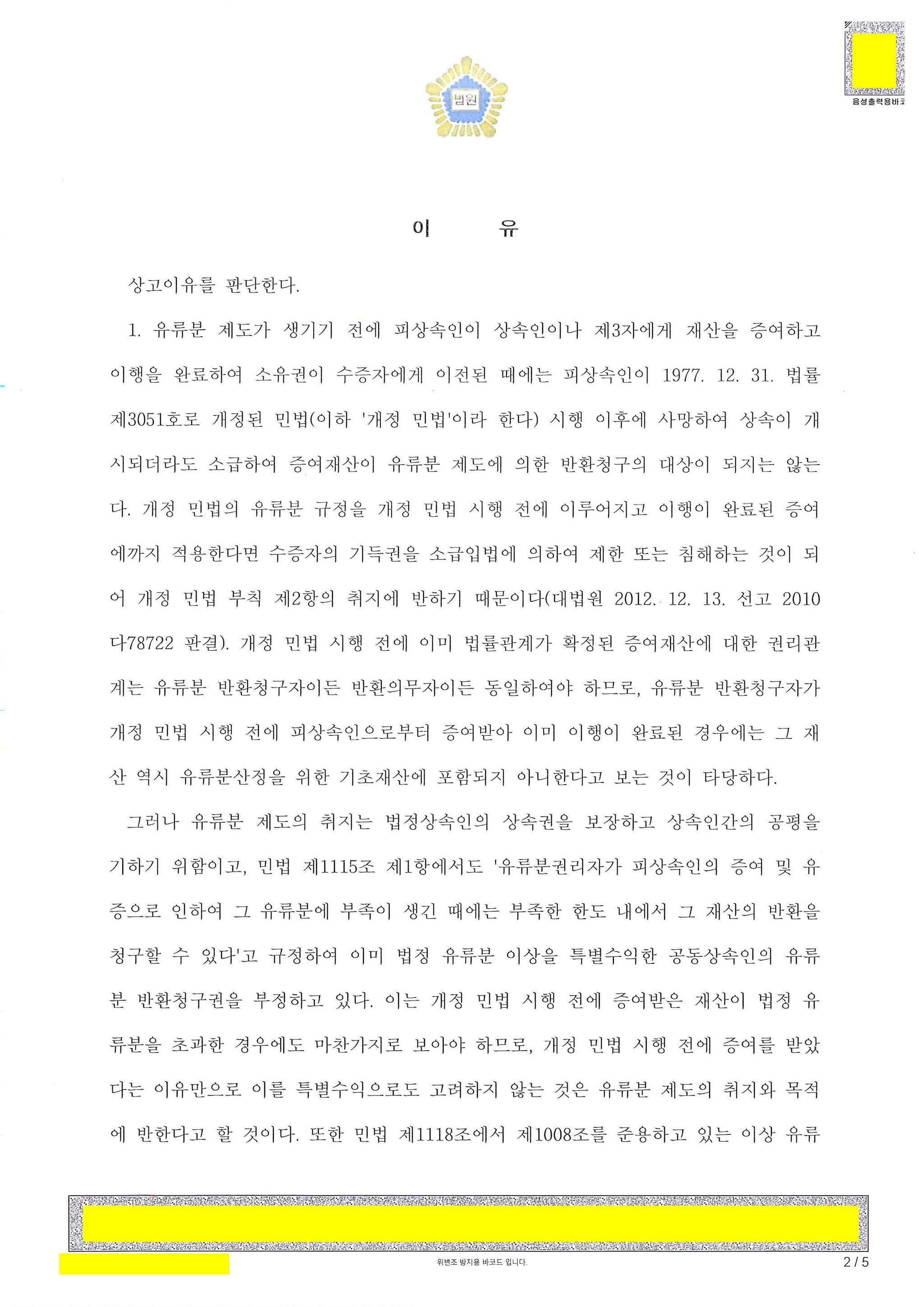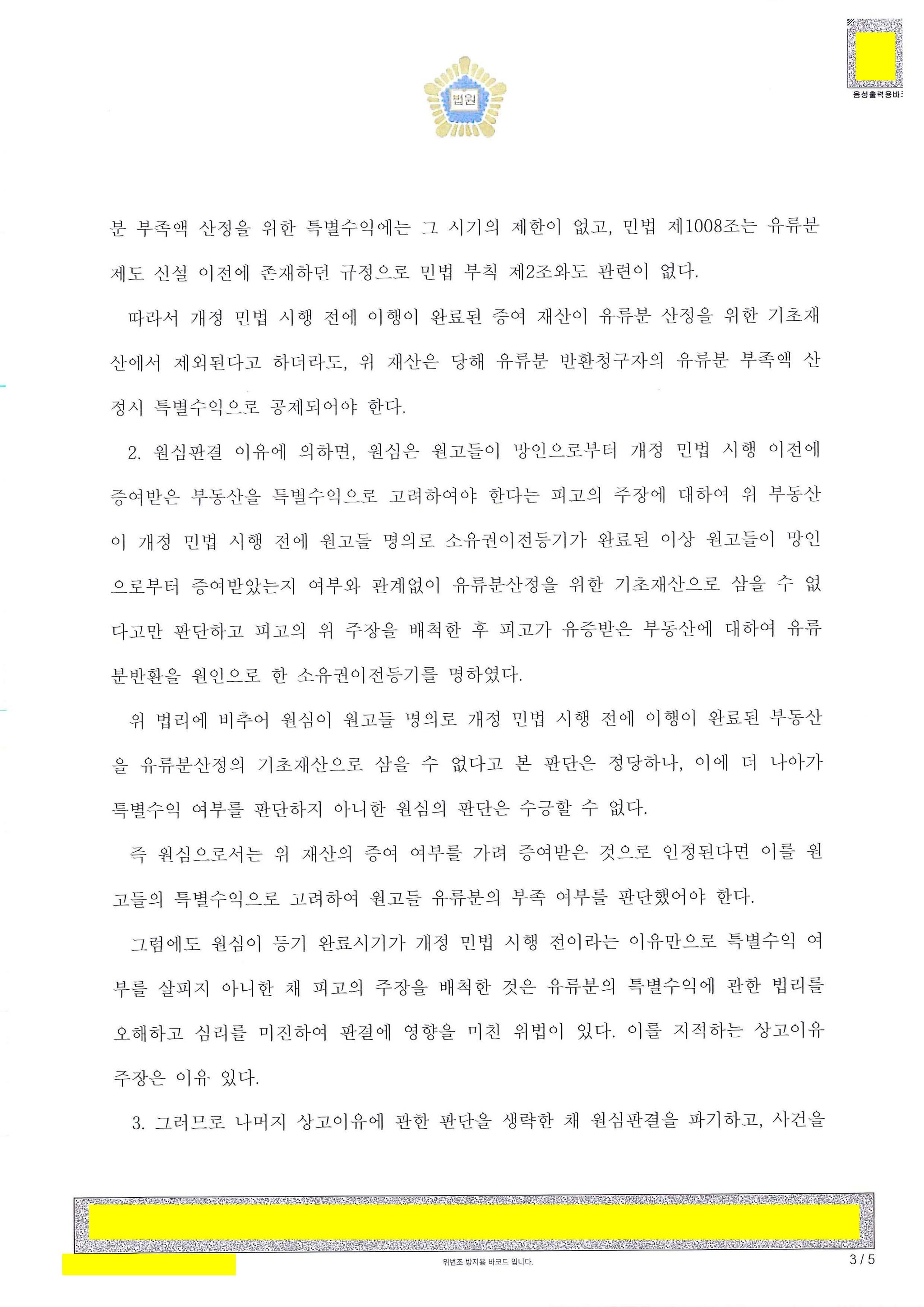 상고심에서 피고의 소송대리인(법률사무소 세웅)은 유류분의 취지와 민법의 특별수익 규정의 법리상 1979. 1. 1. 이전의 증여는 유류분산정의 기초재산에 포함되지도 않더라도 원고의 특별수익 계산에는 고려되어야 한다고 주장. 대법원이 이를 받아들였습니다.