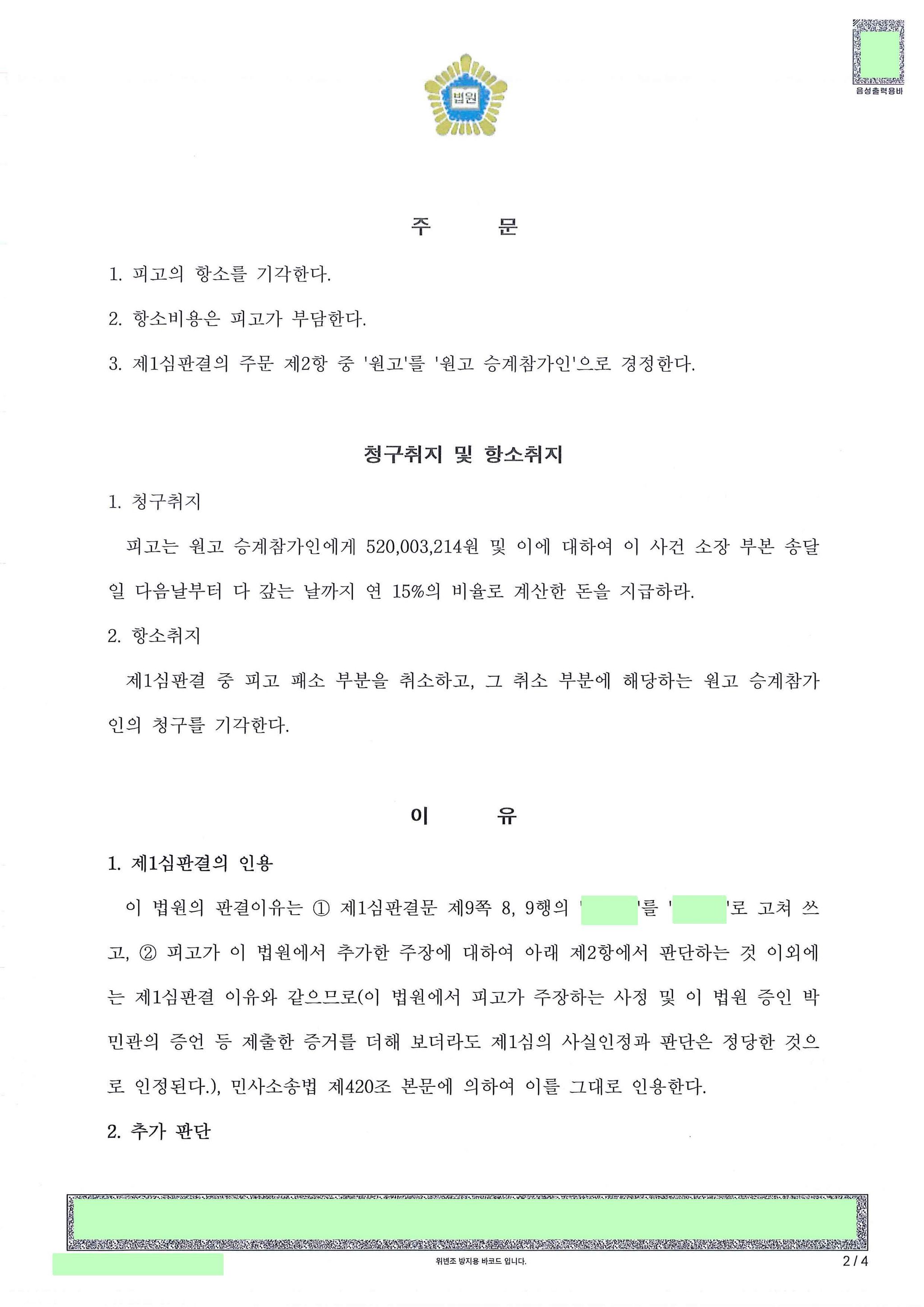 원고 승소(피고 항소 전부 기각) 마무리가 된 사안입니다.