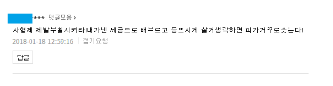 주로 살인, 강도, 강간 등 강력범죄에 대한 법원 판결을 보도하는 인터넷 기사에 주로 달리는 댓글입니다. 위 댓글은 살인을 저지른 피고인에게 법원이 무기징역을 선고 했다는 기사에 달린 댓글이었습니다.