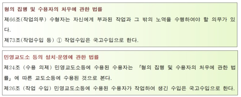 그리고 이 때 수용자들의 작업에서 얻어진 수입은 국고에 귀속되게 됩니다. 따라서 유기징역이나 무기징역을 선고받은 수용자들은 원하지 않더라도 교도소에서 일을 할 수밖에 없고 그 수입은 국가의 수입이 됩니다.