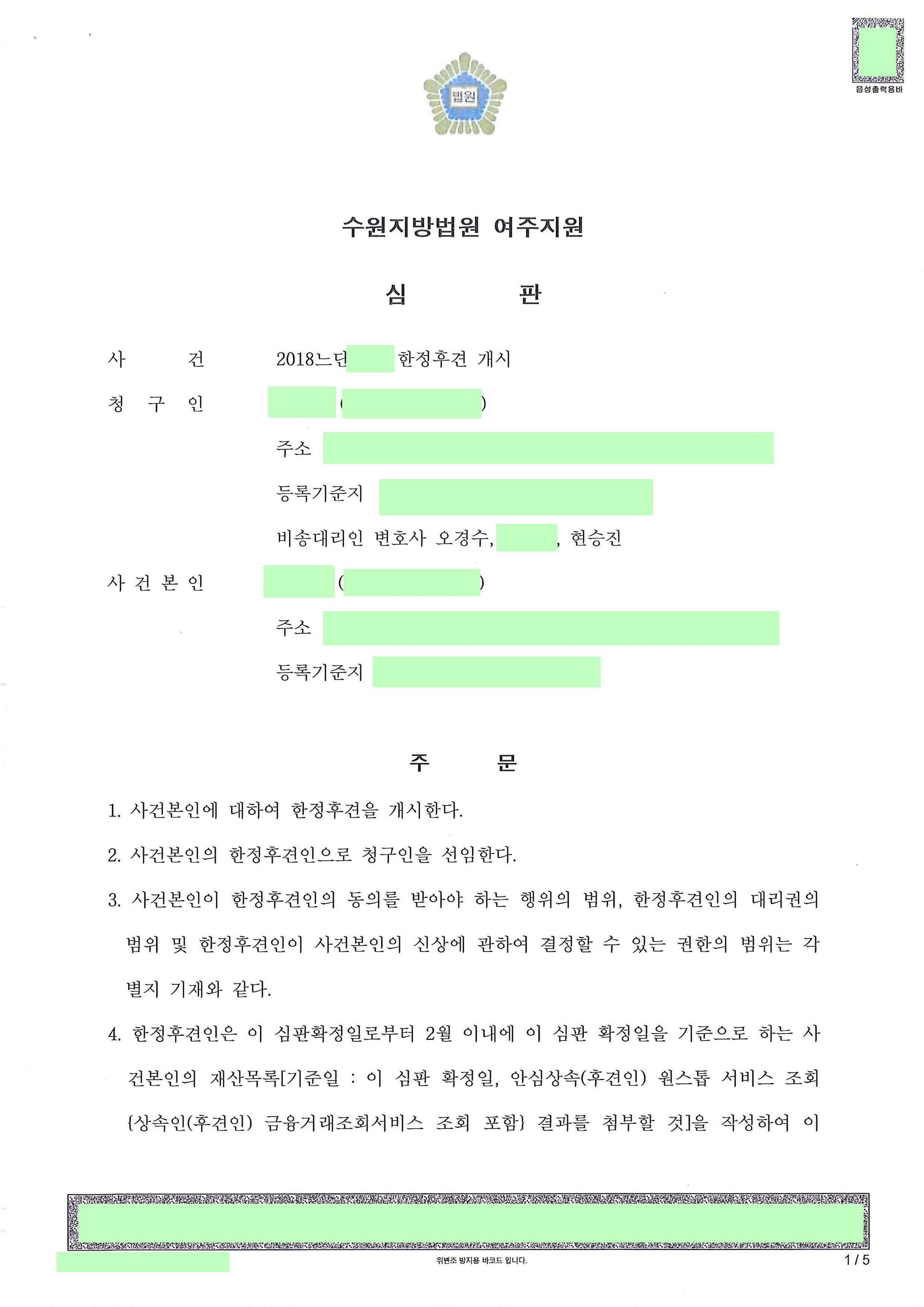 청구인은 사건본인의 배우자. 사건본인은 휴대폰 게임에 중독되어 한 달에 수백만 원을 지출. 사건본인이 가족들까지 게임중독으로 채무초과 상태에 빠뜨리자 배우자인 청구인이 한정후견을 신청했던 사안입니다.