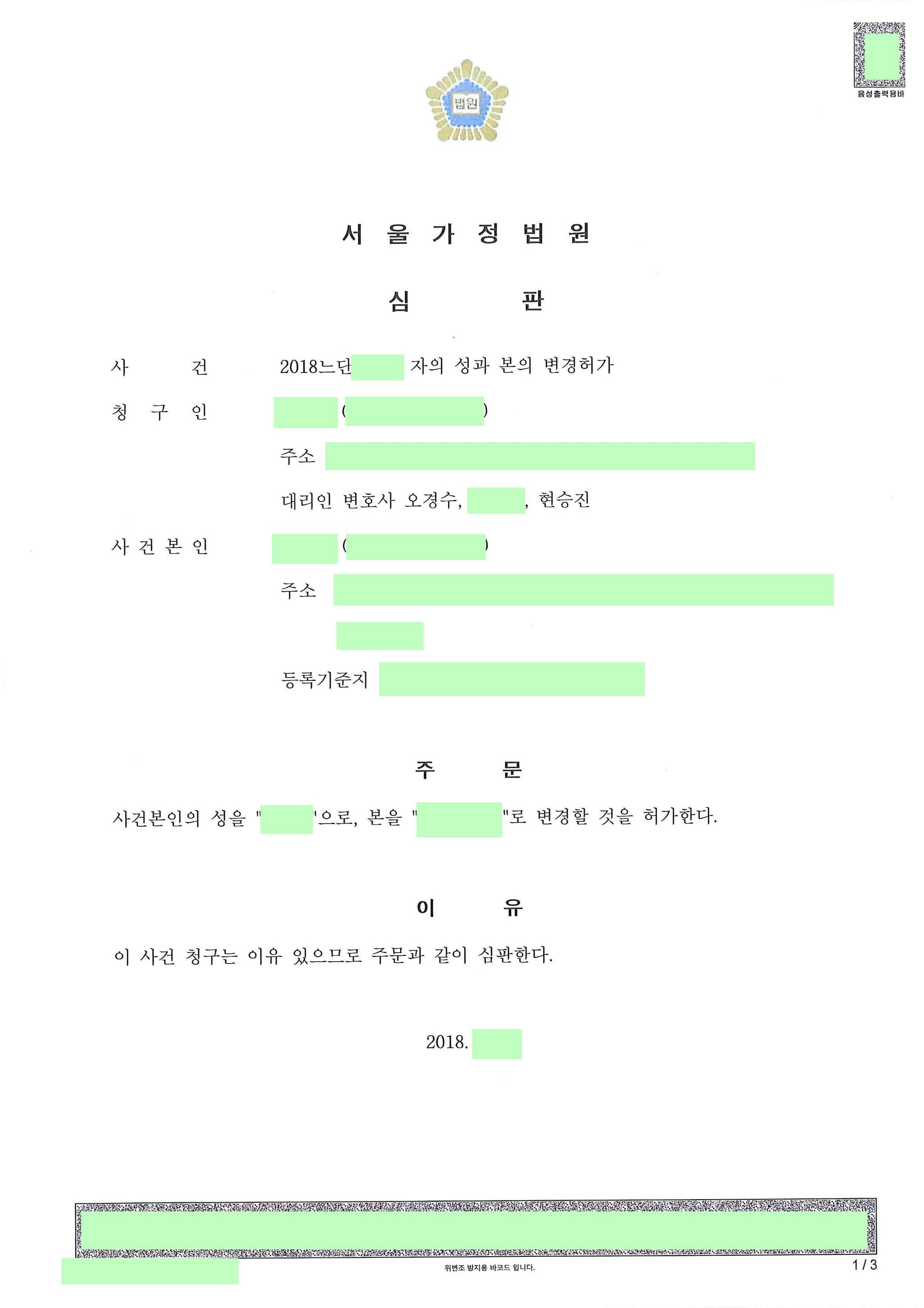청구인의 소송대리인은, 이미 친부와는 오래 전에 가족적 유대관계가 단절되었고, 계부가 사실상 친부와 다름없을 정도로 가족관계를 형성하고 있다는 점을 강조하여 성년자인 사건본인의 성과 본을 변경하여야 할 필요가 있다고 주장. 법원은 청구인의 청구를 받아들였습니다.