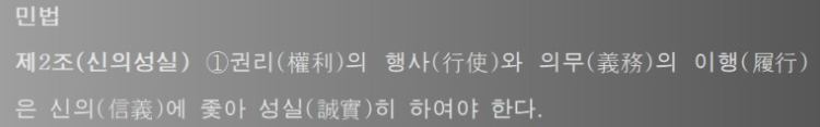 법률에는 ‘신의성실의 원칙’이라는 원칙이 있습니다. 법률관계에 있어서 서로 상대방의 이익을 배려하고 형평에 맞지 않거나 신뢰에 반하는 행동을 해서는 안 된다는 추상적 원칙입니다. 이에 대해서 민법 제2조 제1항은 다음과 같이 규정하고 있습니다.