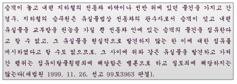 이는 A가 가져간 가방과 B가 가져간 스마트폰의 ‘점유’에 대해서 법률적인 평가가 다르기 때문입니다. A가 가져간 가방은 승객이 점유를 상실하였고 그 외 다른 사람이 점유 하고 있다고 보기 어렵습니다. 지하철과 같이 사람들의 출입이 잦은 곳에 있는 물건을 전동차의 기관사나 역무원 등이 점유하고 있다고 볼 수는 없는 것이지요.