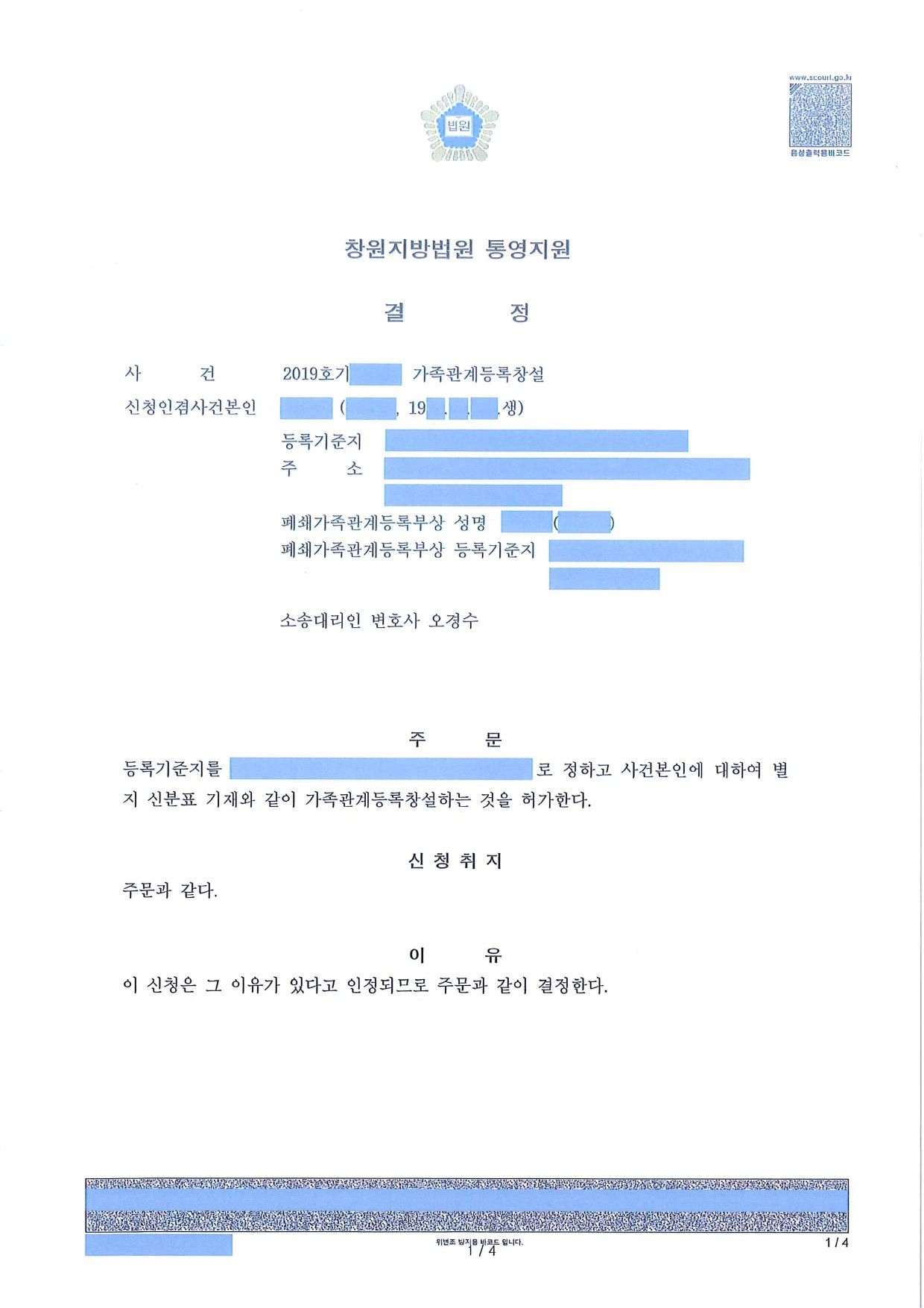 청구인은 외국 거주 중, 가족관계등록부상 부모인 000과 xxx로부터 친생자관계부존재의 소를 받음. 이 친생자사건의 결과 청구인의 출생신고가 무효가 되면서 가족관계등록부가 폐쇄. 이에 청구인에 대한 가족관계등록부를 창설 및 성과 본의 창설허가를 신청한 사안입니다.