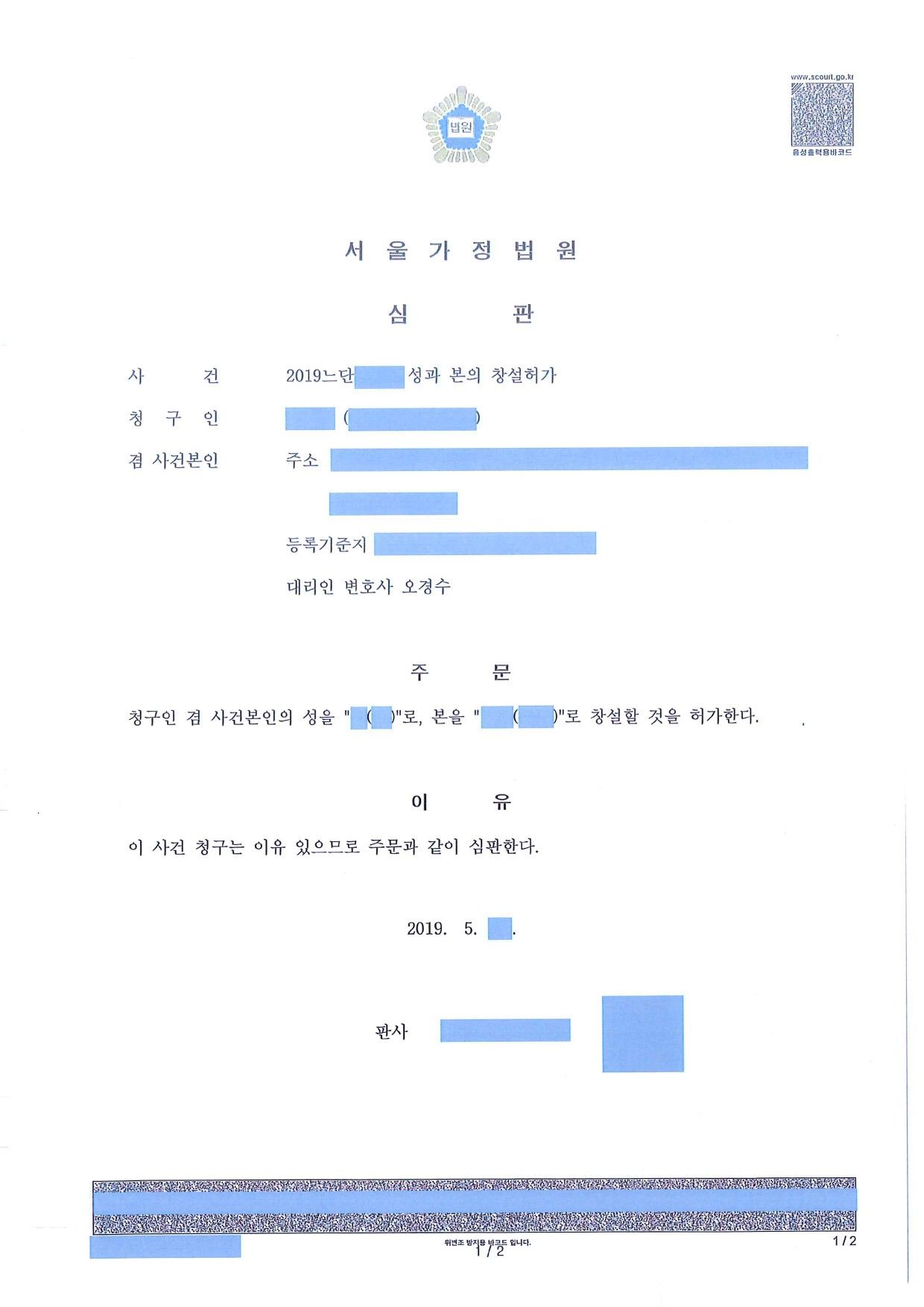 가족관계등록부창설 및 성과 본의 창설 허가(청구인용).