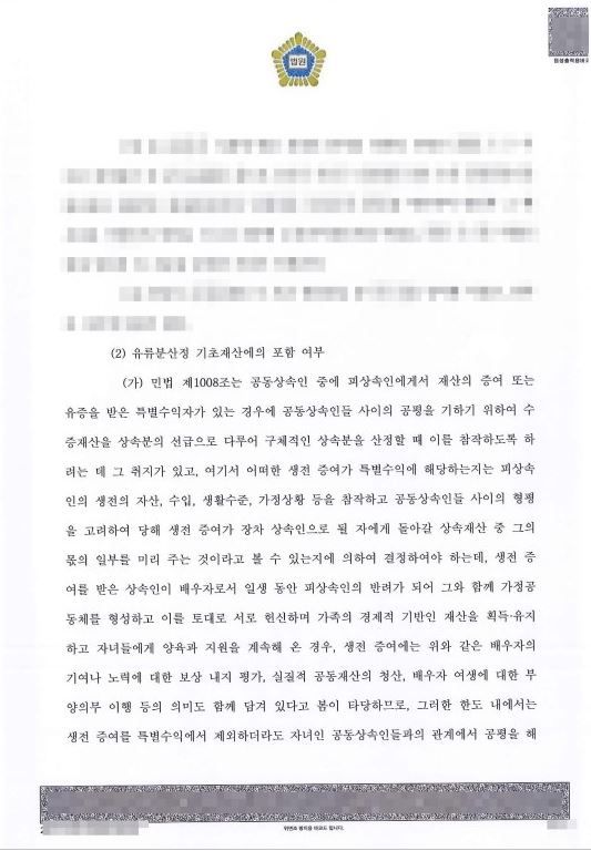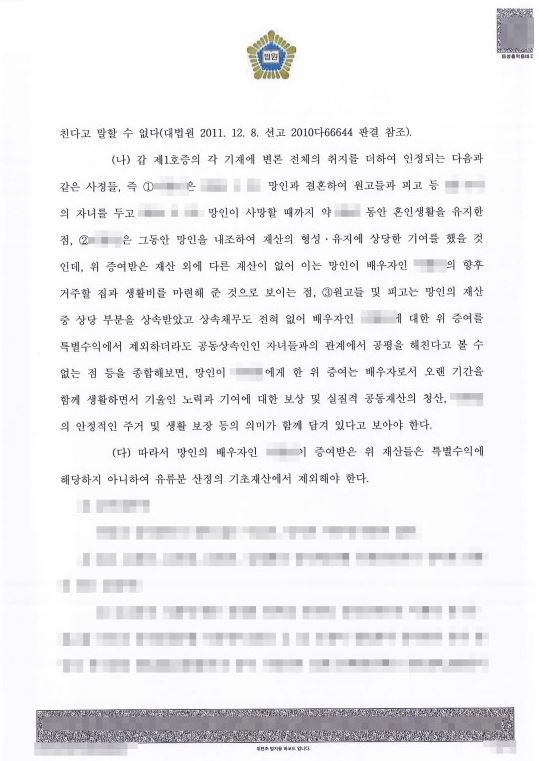 다음은 법률사무소 세웅(오경수 변호사)가 배우자 특별수익을 주장하여 유류분반환을 구하는 원고들의 청구를 모두 기각한 사안의 실제 판결문의 일부 입니다.