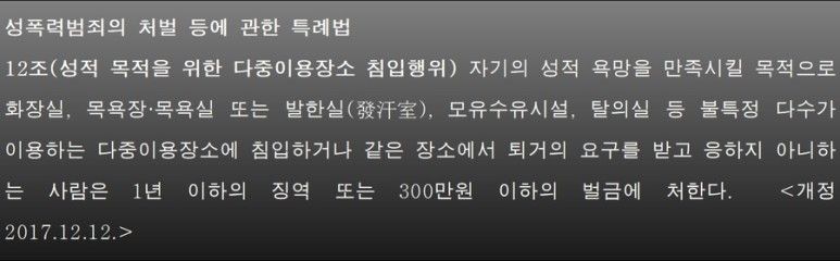 예전에 ‘여자화장실에 들어가면 무슨 죄가 되나요?’라는 제목으로 성적목적공공장소침입에 대한 포스팅을 했던 적이 있었습니다. 그 때 제가 2017. 12. 12.을 기준으로 이전에는 공중화장실 등에 관한 법률에 규정된 공중화장실이 아닌 화장실에 침입한 경우에는 성폭력범죄의 처벌 등에 관한 특례법을 적용할 수 없었지만 2017. 12. 12. 개정법이 시행되면서 이후에는 성폭력범죄로 처벌이 가능하다는 점을 말씀 드렸습니다.(https://blog.naver.com/hyun_lawyer/221245783676)