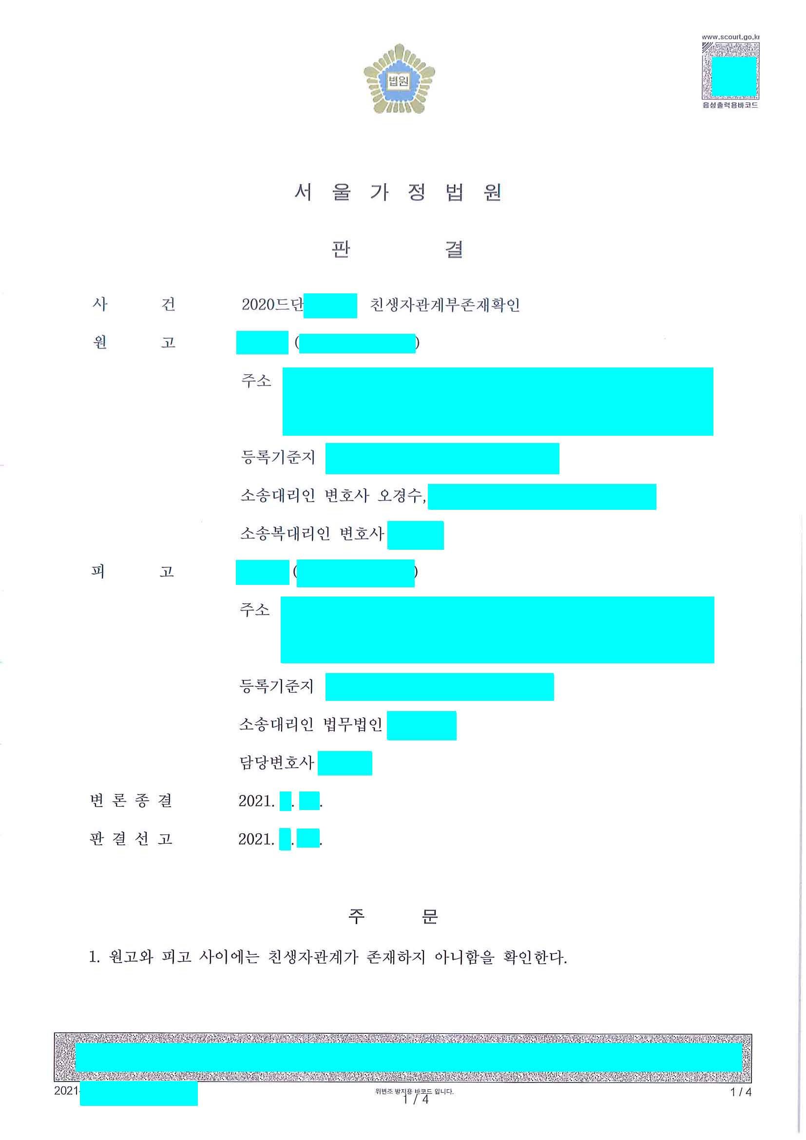 피고와 피고의 친모가 모두 외국에 거주하고 있었는데, 당시 코로나19 바이러스 창궐로 이동이 제한되어 유전자검사가 어려웠던 상황. 이에 원고의 대리인이었던 법률사무소 세웅(현 법무법인 세웅)은 피고 및 피고의 친모의 확인서, 당시 출생신고를 했던 소외 망 ooo의 형을 소환하여 증인신문 등을 진행 함. 그리하여 법원은 유전자감정 없이 친생자관계가 없다는 점을 인정하였습니다.