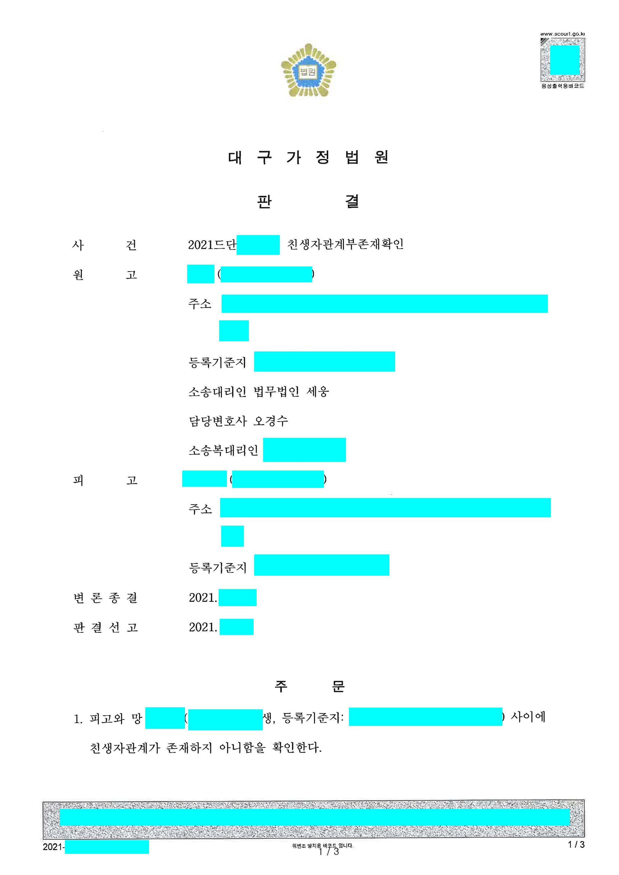 원고는 피고의 자녀. 피고의 생모는 망 A이나 피고의 가족관계등록부상 모친은 망 B로 되어 있음. 이제 피고의 자녀가 원고가 되어 친생자관계존부확인 소송을 제기한 사안입니다.