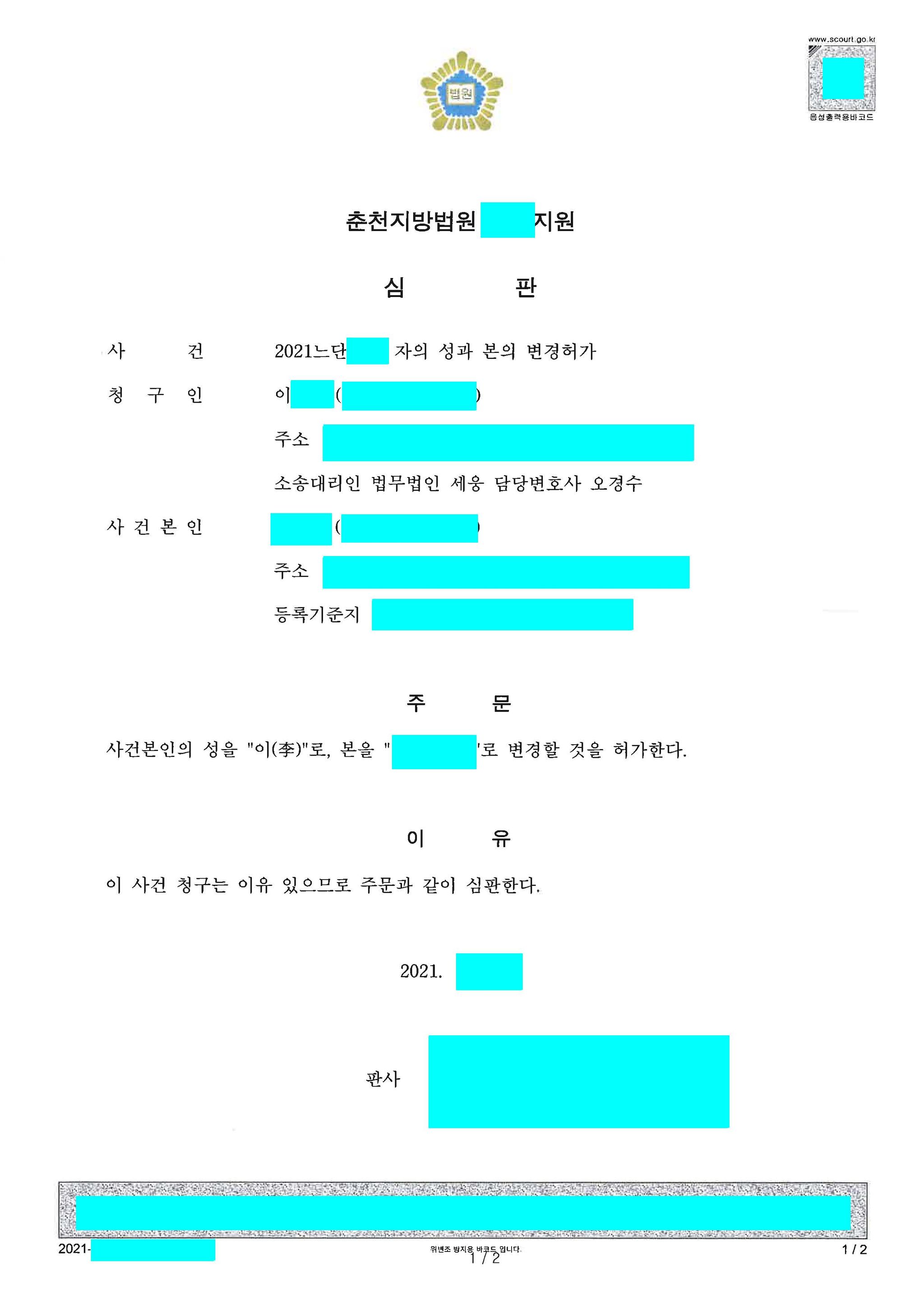 청구인의 소송대리인은, 사건본인과 친부는 오래 전에 가족적 유대관계가 단절되었고, 사건본인이 사회생활을 앞두고 있기 때문에 서둘러 모의 성과 본으로 사건본인의 성과 본을 변경할 이유가 있다는 점을 강조. 법원은 청구인의 청구를 받아들였습니다.
