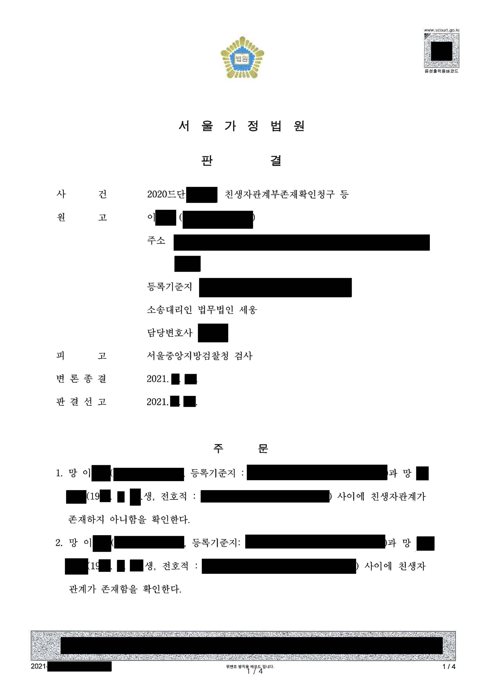 원고는 A의 조카(원고의 두 부모님도 모두 사망). A의 가족관계등록부상 모친(사망)과 생모(사망)다름. A가 생모와 가족관계등록부상 모친을 상대로 친생자관계존부확인을 소송 제기를 할 수 없었던 상태(제척기간 2년 도과). 그리하여 A의 조카가 원고가 되어 소 제기한 사안입니다.