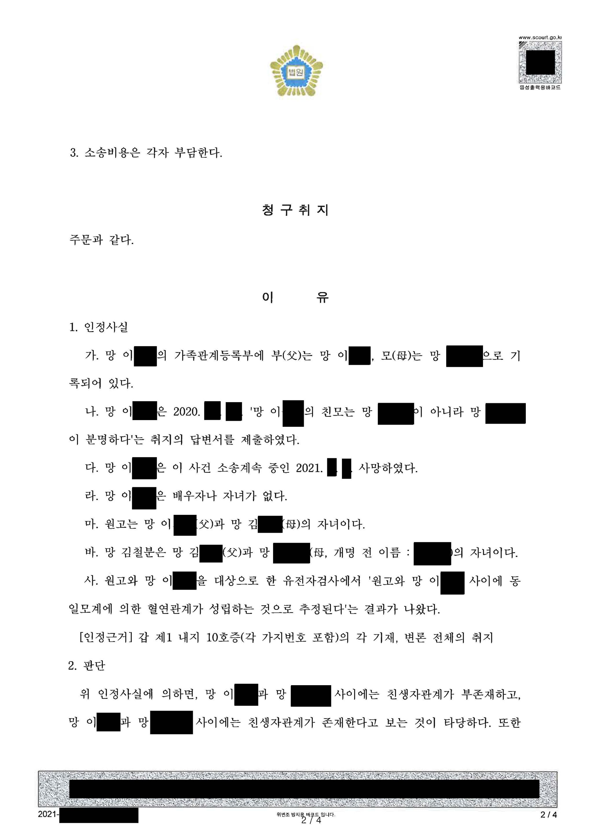 원고와 A 사이의 유전자검사를 통해 동일모계에 있다는 점 밝힘. 그런데 소송 중 A가 사망하여 원고는 검사를 상대로 소송을 계속 이어갔습니다.