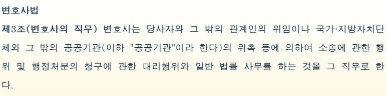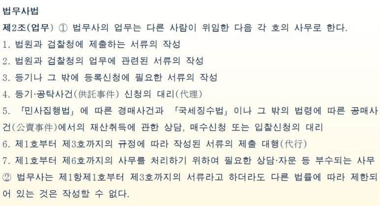 많은 분들의 예상과는 달리 제일 짧고 간결하게 되어 있지요? 그 이유는 간단합니다. 변호사는 법률사무를 ‘모두’ 할 수 있기 때문입니다. 위의 법무사나 행정사의 업무 뿐 아니라 세무사나, 경우에 따라서는 변리사의 업무까지도 할 수 있습니다.