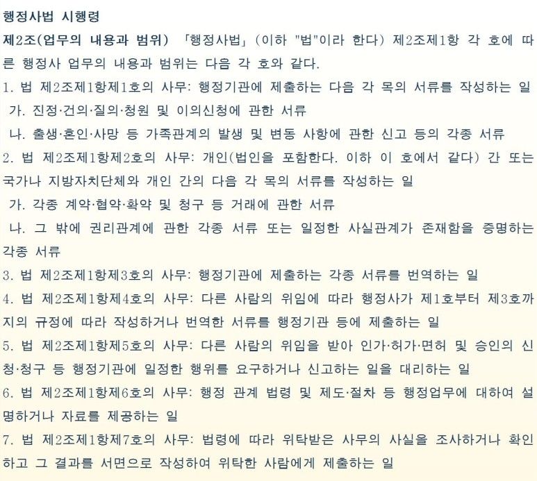 행정사법을 보면 행정사의 업무도 법무사와 비슷한 것 같지만, 행정사법 시행령을 살펴보면 특정한 서류의 작성, 번역, 제출 등의 업무로 범위를 제한하고 있어서 실제로 법무사보다 업무범위가 좁습니다. 행정기관에 제출하는 서류만을 작성하는 것이기 때문에 법원 등에 제출하는 서류는 원칙적으로 행정사가 작성할 수 없습니다.