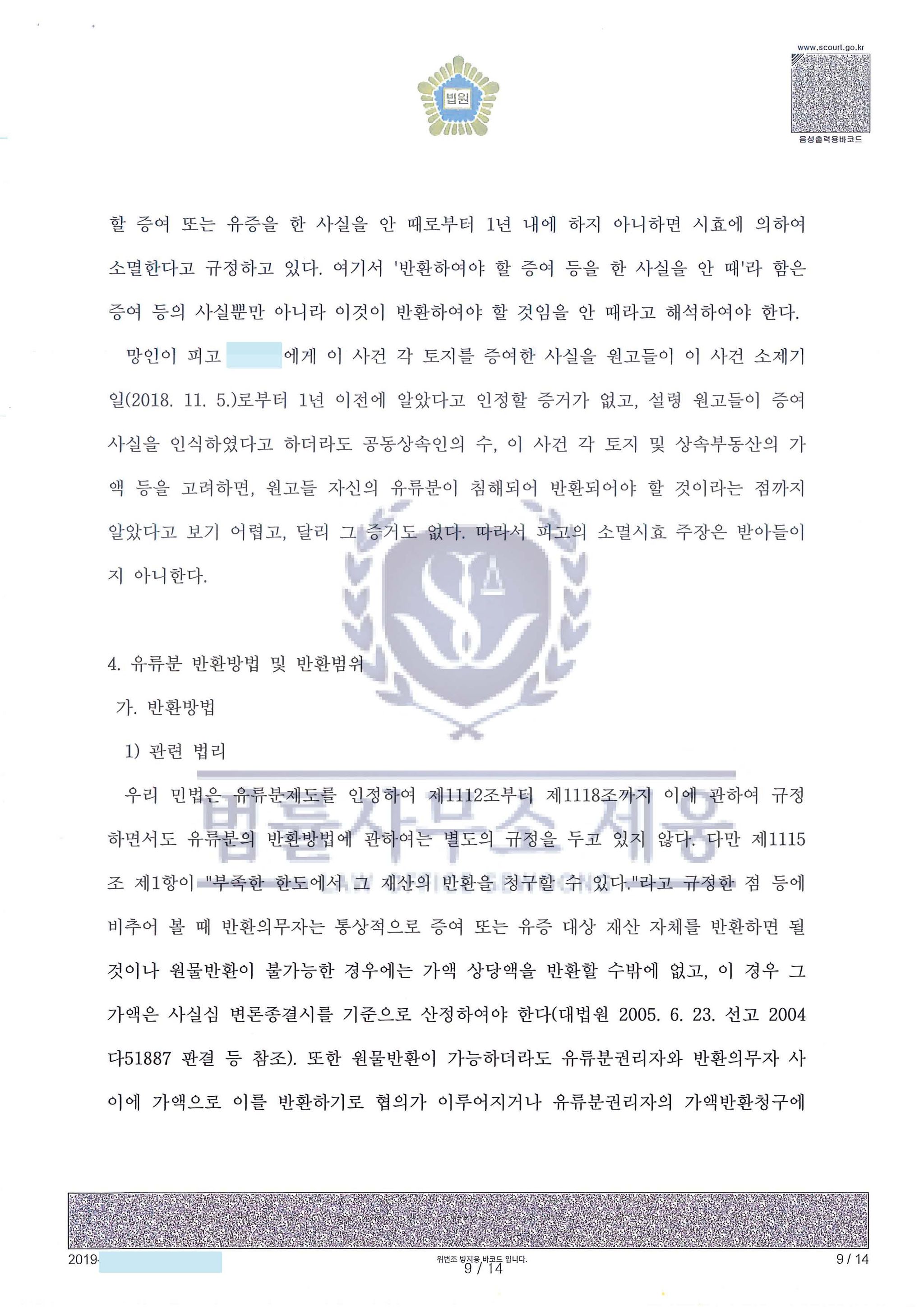 위 판례에서 법원은 "망인이 피고1에게 이 사건 각 토지를 증여한 사실을 원고들이 이 사건 소 제기일로부터 1년 이전에 알았다고 인정할 증거가 없고, 설령 원고들이 증여사실을 인식하였다고 하더라도 공동상속인의 수, 이 사건 각 토지 및 상속부동산의 가액 등을 고려하면, 원고들 자신의 유류분이 침해되어 반화되어야 할 것이라는 점까지 알았다고 보기 어렵고, 달리 그 증거도 없다. 따라서 피고의 소멸시효 주장은 받아들이지 아니한다"라고 판시하였습니다.