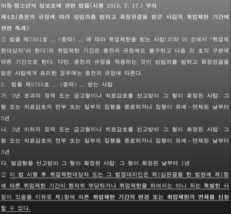 (과거 헌법재판소의 위헌 결정으로 취업제한 대상이 아니었으나 개정 법률에 딸 대상이 된 사람들에 대해서는 위 ‘성범죄 취업제한 개정, 소급적용과 면제는?’ 포스팅을 참조하시기 바랍니다.)