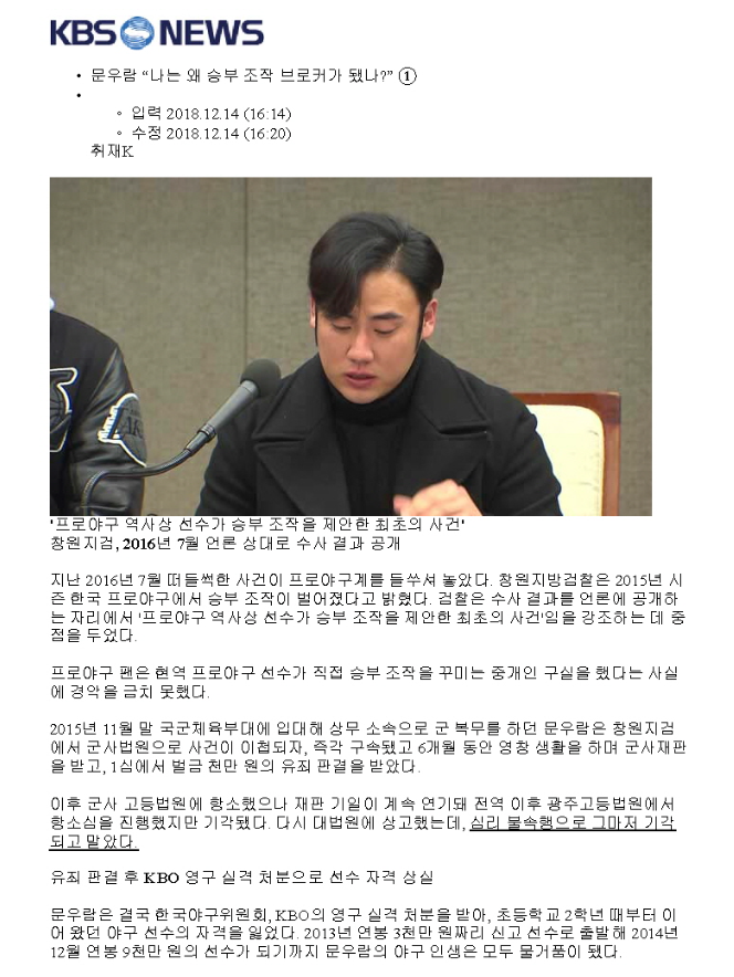 프로야구를 좋아하시는 분들이라면 이슈가 되고 있는 문우람 선수의 승부조작관련 인터뷰와 그 과정에서 폭행 피해사실 폭로에 대해서 들어보셨을 것 같습니다.