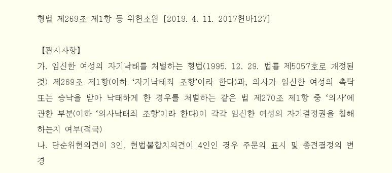 지난 4. 11. 헌법재판소는 모자보건법 상의 예외사유를 제외하고는 임신기간 전체를 통틀어 낙태를 금지하고 있는 형법 제269조 제1항에 대해서 과잉금지원칙을 위반하여 임신한 여성의 자기결정권을 침해한다고 판단하였습니다.