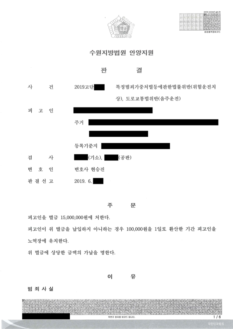 그리고 결국 이와 같은 노력 덕분에 윤창호법이 적용되는 사안에서 벌금형의 선처를 받을 수 있었습니다.