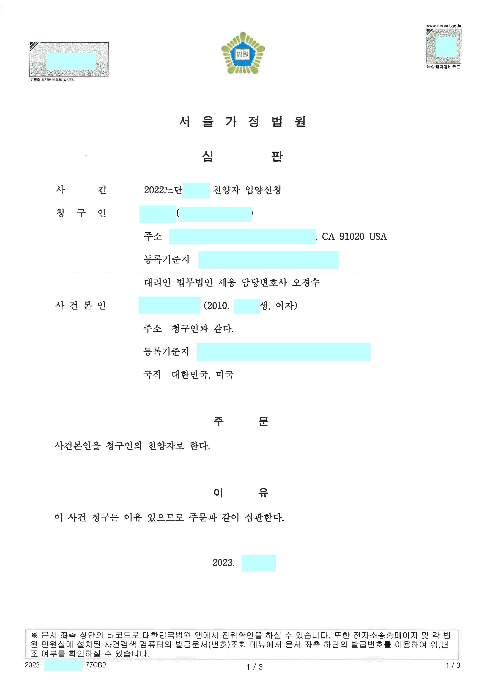 친양자 입양 청구 인용으로 마무리가 된 사안입니다.