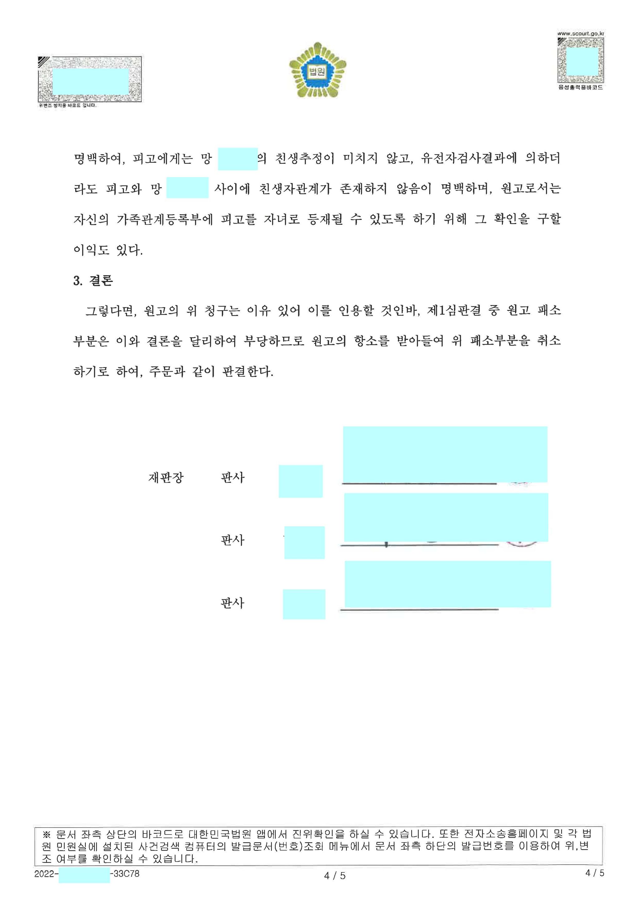 그런데 1심 법원은, 원고와 피고 사이의 친생자관계존재 청구는 받아들였지만, 피고와 A 사이의 유전자검사 만으로는 원고와 A 사이의 동서의 결여가 명백하다고 할 수 없어 원고와 A 사이의 친생자부존재확인의 소를 각하함. 이에 원고는 패소 부분 항소.