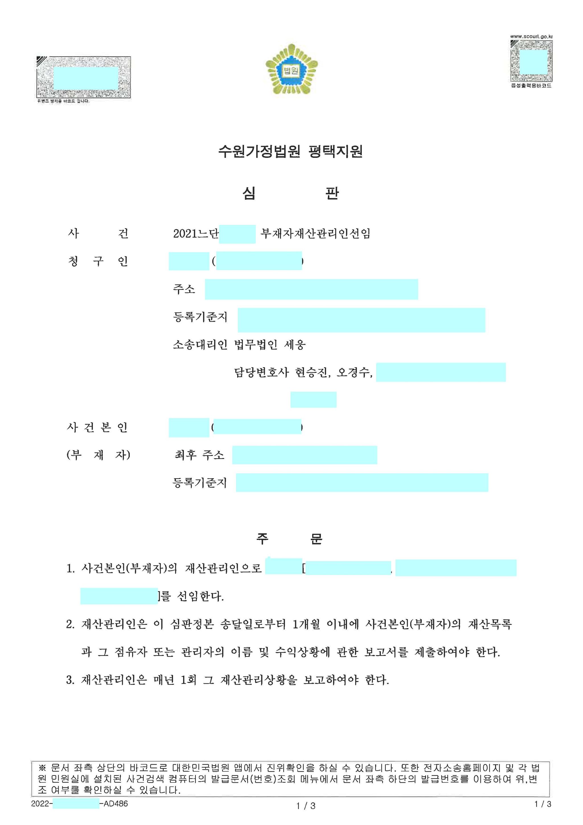 그리하여 청구인은 사촌형제를 사건본인의 부재자재산관리인으로 선임해 줄 것을 청구하고 부재자재산관리인이 선임되면 법원의 허가를 받아 사건본인의 재산을 분배하려고 한 사안입니다.