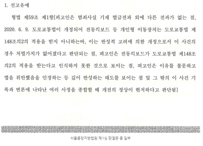 그러나 속도나 무게 등에서도 자전거와 비슷한 개인형 이동장치를 자동차와 동일한 기준으로 음주운전 처벌 하는 것은 부당한 것이고, 개정법은 이와 같은 점에 대한 반성적 고려에서 비롯된 것이라고 봄이 타당하다는 것이 저의 생각입니다.