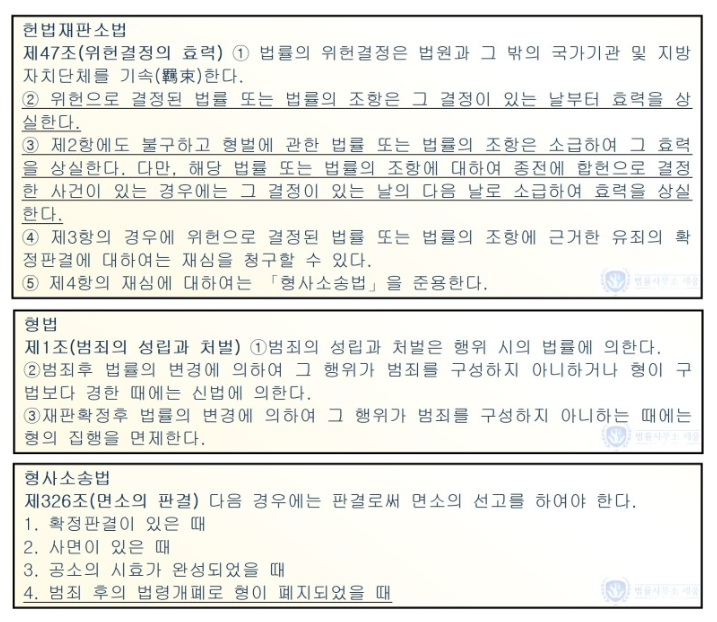이 때문에 간혹 무죄 판결이 선고되어야 하는 경우인지 면소 판결이 선고되어야 하는 경우인지 혼란스러울 때가 있을 수 있습니다. 특히 대법원 2019. 12. 24. 선고 2019도15167 판결은 간통죄에 대한 재심에서 무죄가 아닌 면소 판결을 선고한 제1심 및 원심의 판단을 정당하다고 한 사안으로 일반적으로 헌법재판소의 위헌결정으로 소급하여 효력을 상실한 법률을 근거로 한 유죄 판결은 재심을 통해서 무죄가 선고되어야 한다고 단순하게 암기하고 있는 경우에 혼란이 올 수 있을 것 같습니다.