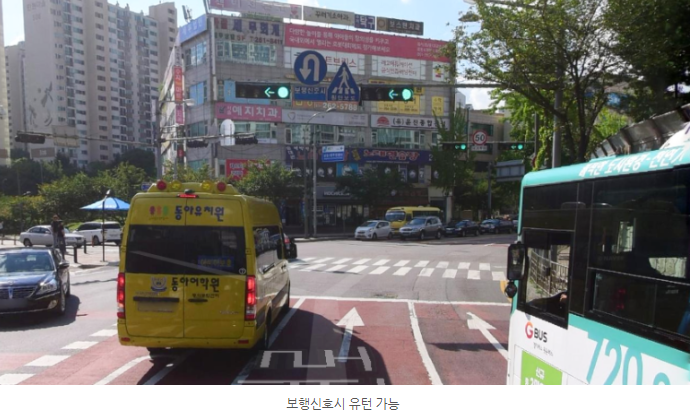 상시유턴구역이란 유턴이 가능하다는 표시만 있을 뿐 언제 유턴을 해야 하는지 정해져있지 않은 곳을 의미합니다. 아래 사진을 보면 ‘보행신호시’에만 유턴이 가능했던 곳이 ‘보행신호시’라는 지시가 없어지면서 상시유턴구역으로 바뀐 것을 확인할 수 있습니다.