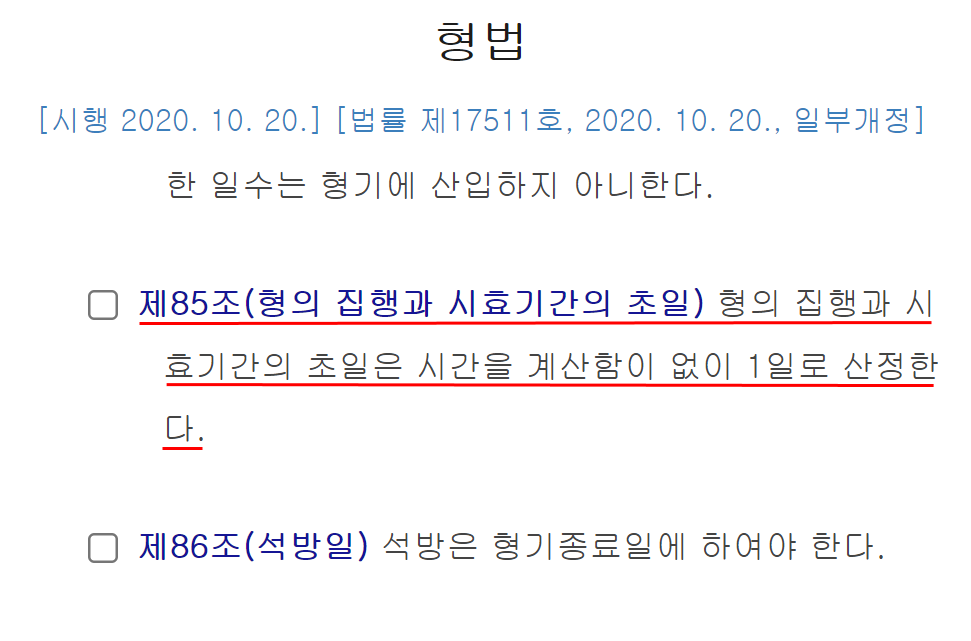 그러나 형법 제85조에서는 형의 집행과 시효기간의 경우에는 첫날을 포함하여 계산하도록 되어 있으므로 집행유예 기간을 계산함에 있어서는 첫날을 포함하여야 하고, 2021. 9. 14.을 포함하여 계산하는 경우 집행유예 기간은 2023. 9. 13.까지가 되는 것입니다.