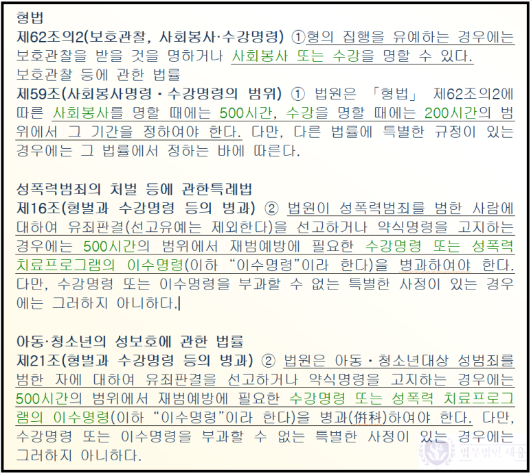 또한 성폭력범죄 및 아동·청소년 대상 성범죄의 경우에는 최대 500시간까지 수강명령을 붙일 수 있습니다(벌금형의 경우에도 성폭력 치료 프로그램 이수명령 부과 가능).